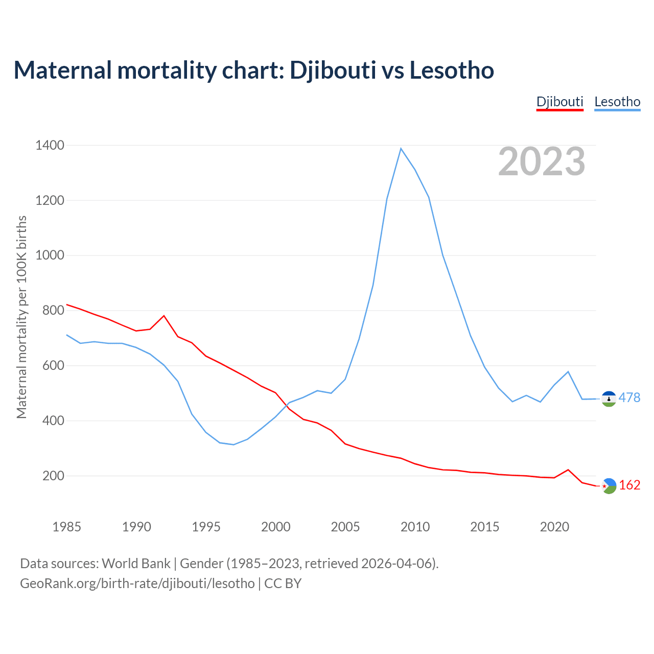 The maternal mortality rate, which is the probability of dying during childbirth or within 42 days of pregnancy termination, is 162 deaths per 100,000 live births in Djibouti, compared to 478 deaths in Lesotho.