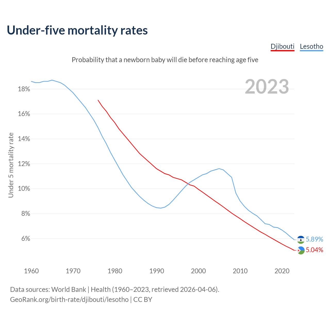 The chance that a newborn baby will die before reaching age five is 5.04% in Djibouti and 5.89% in Lesotho. Above is a chart with historical data on under-five mortality rates.