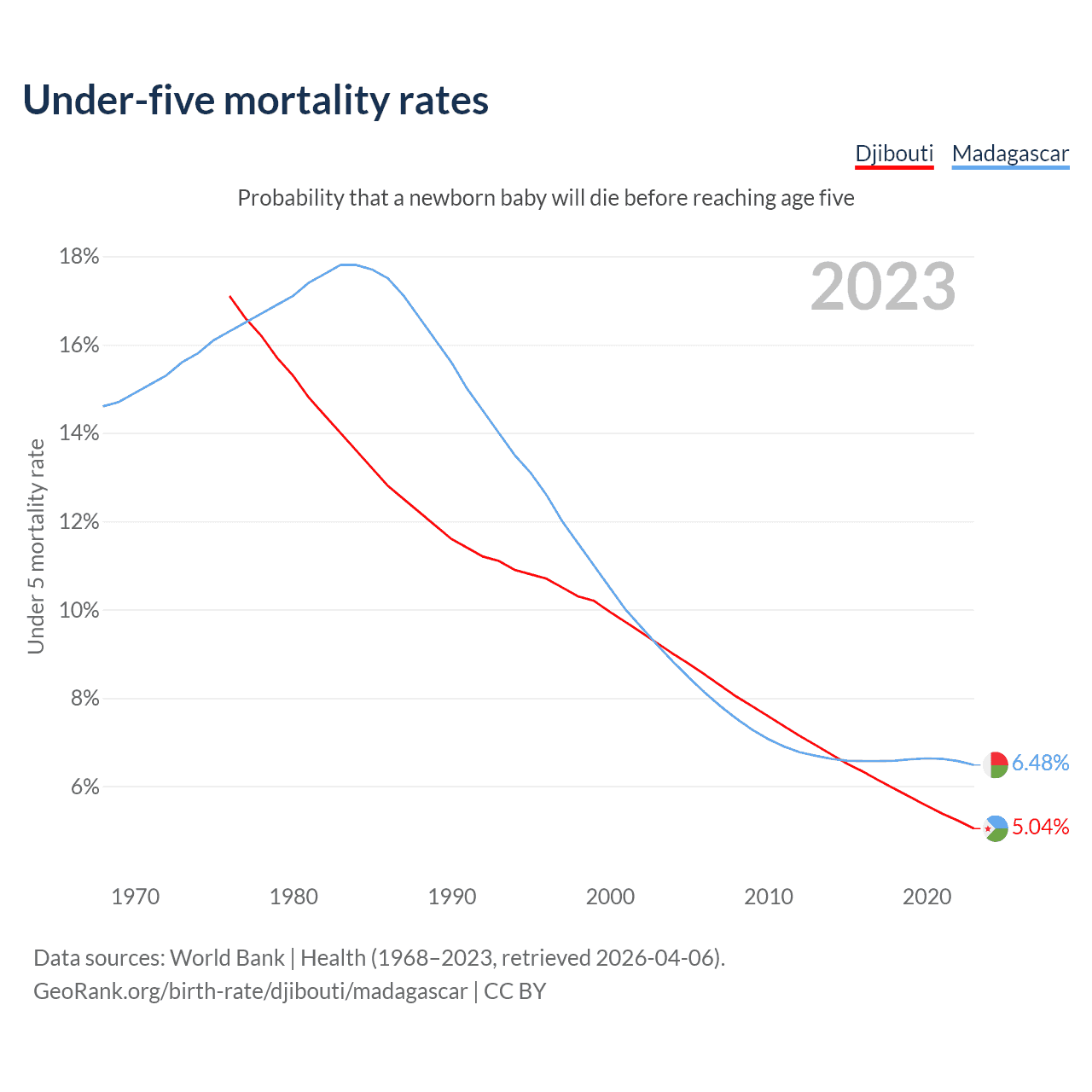 The chance that a newborn baby will die before reaching age five is 5.04% in Djibouti and 6.48% in Madagascar. Above is a chart with historical data on under-five mortality rates.