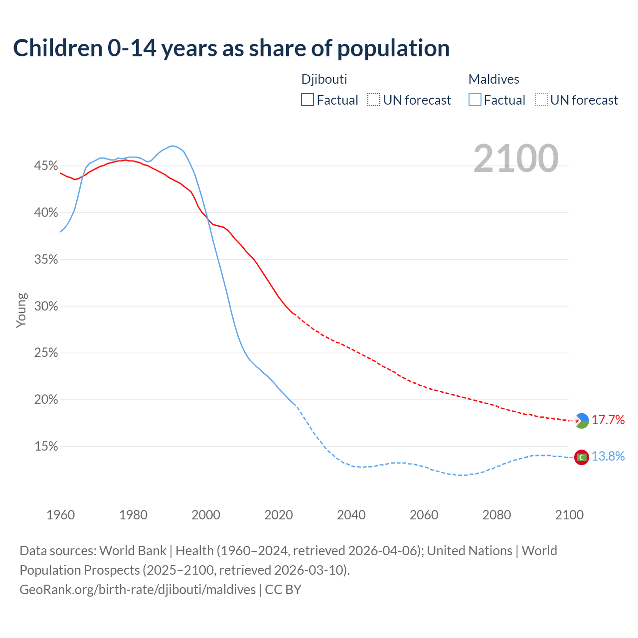 According to the latest available data on birth rates, the fertility rate in Djibouti was 2.61 children per woman in 2023, compared to 1.58 in Maldives in 2023. The replacement level is considered to be 2.1 children per woman.