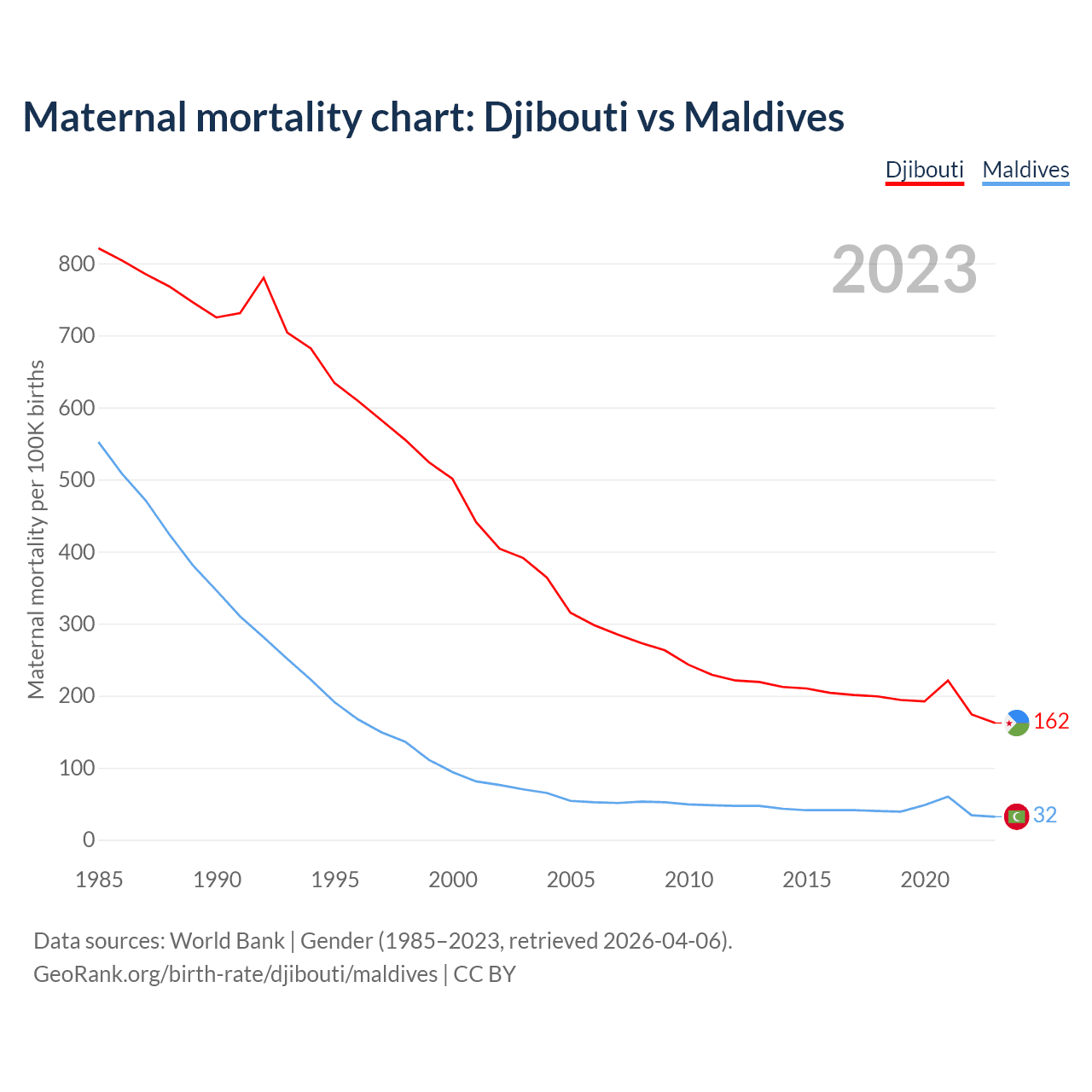 The maternal mortality rate, which is the probability of dying during childbirth or within 42 days of pregnancy termination, is 162 deaths per 100,000 live births in Djibouti, compared to 32 deaths in Maldives.