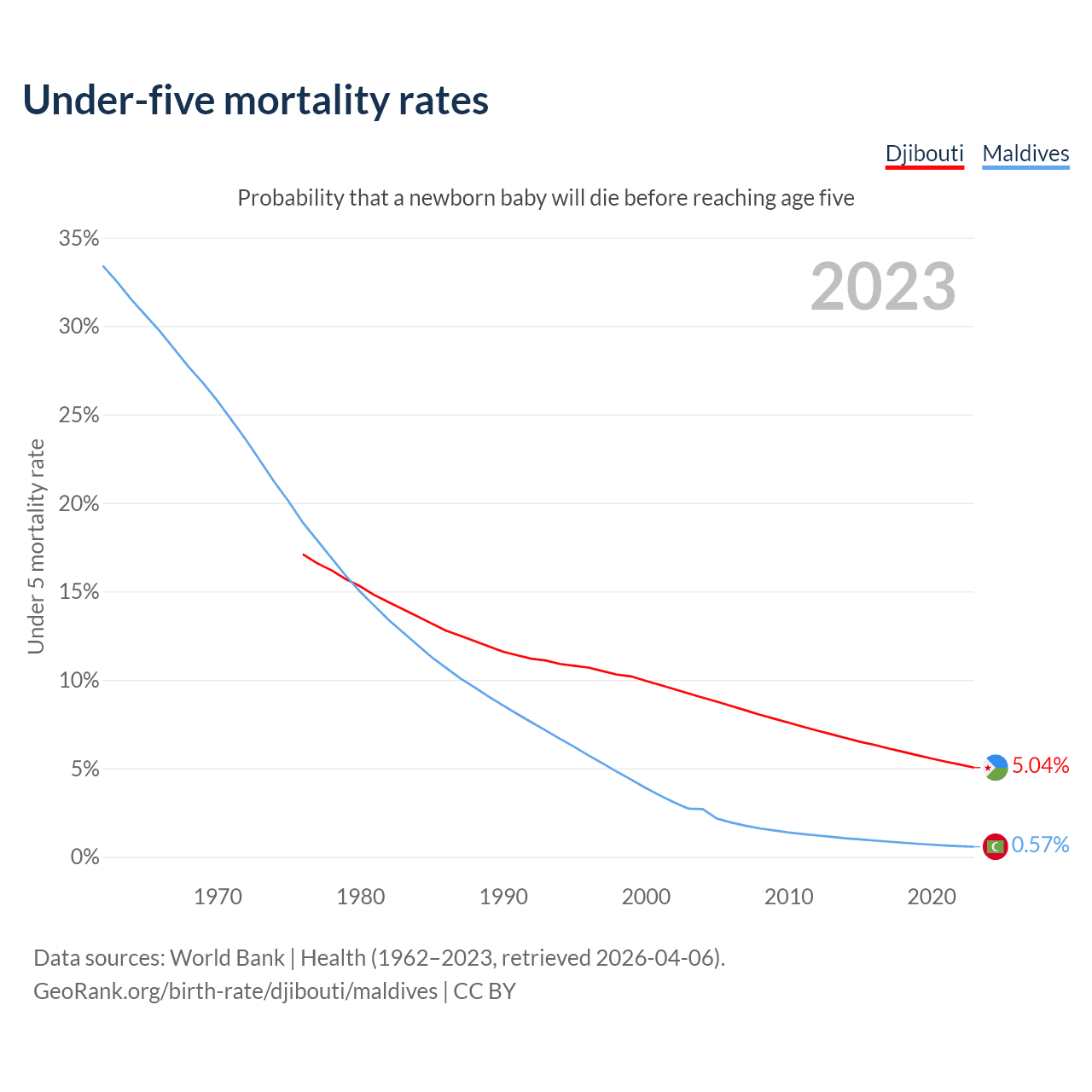 The chance that a newborn baby will die before reaching age five is 5.04% in Djibouti and 0.57% in Maldives. Above is a chart with historical data on under-five mortality rates.