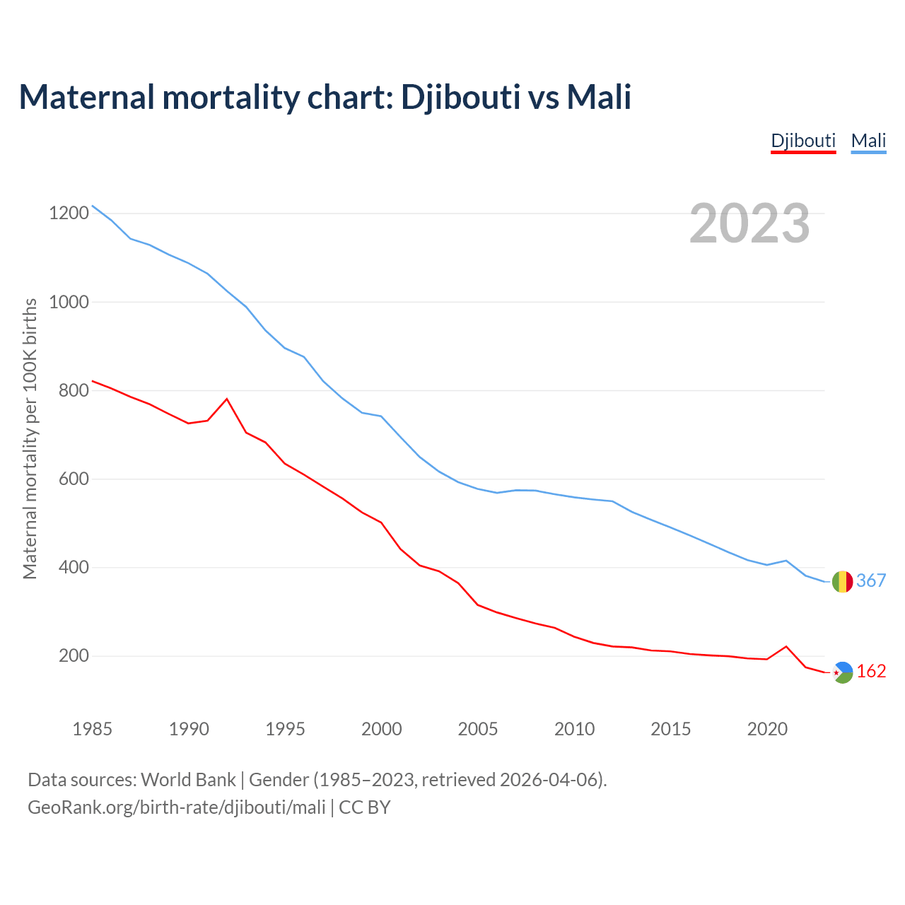 The maternal mortality rate, which is the probability of dying during childbirth or within 42 days of pregnancy termination, is 162 deaths per 100,000 live births in Djibouti, compared to 367 deaths in Mali.