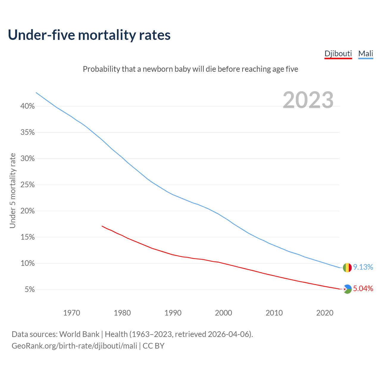The chance that a newborn baby will die before reaching age five is 5.04% in Djibouti and 9.13% in Mali. Above is a chart with historical data on under-five mortality rates.