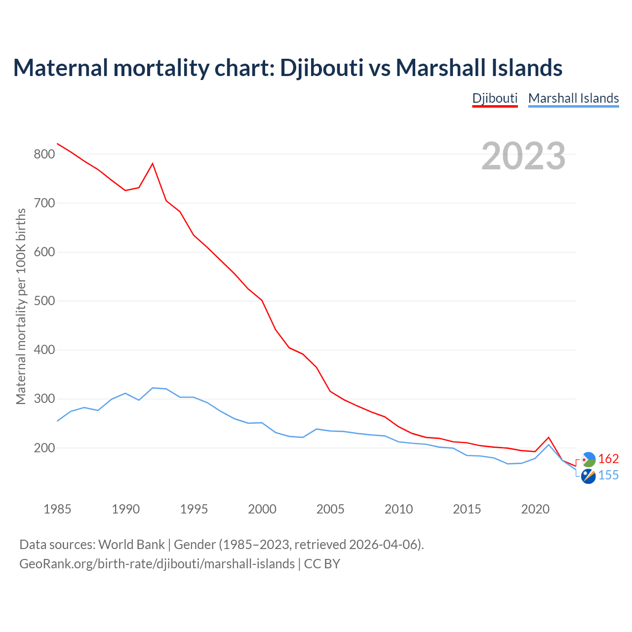 The maternal mortality rate, which is the probability of dying during childbirth or within 42 days of pregnancy termination, is 162 deaths per 100,000 live births in Djibouti, compared to 155 deaths in the Marshall Islands.