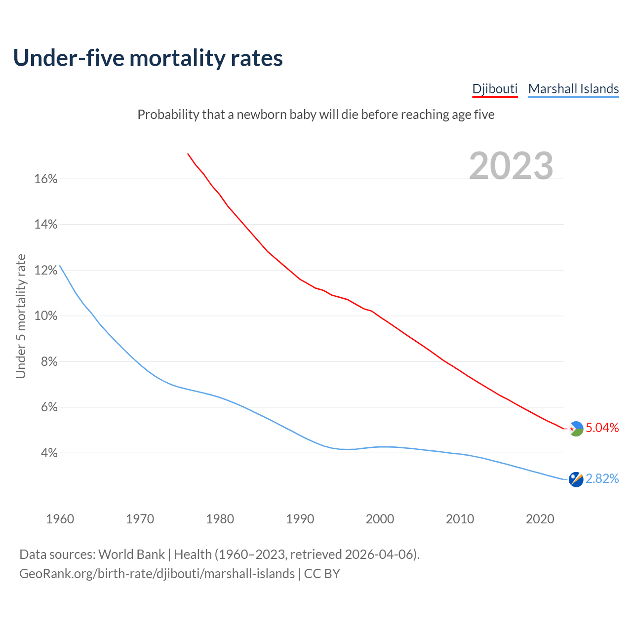 The chance that a newborn baby will die before reaching age five is 5.04% in Djibouti and 2.82% in the Marshall Islands. Above is a chart with historical data on under-five mortality rates.