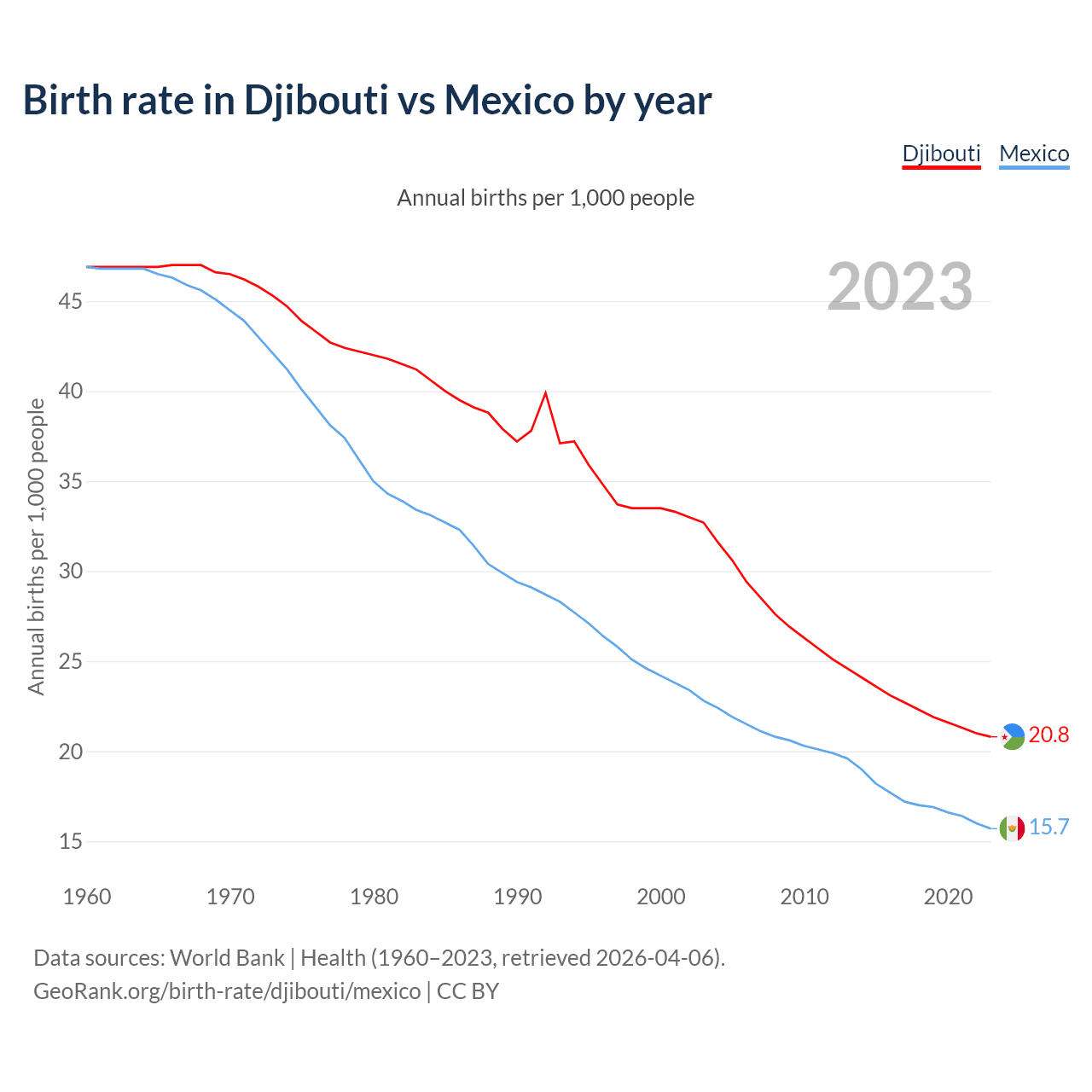 Djibouti has an annual birth rate of 20.8 births per 1,000 people, compared to 15.7 for Mexico. The average number of children a woman is expected to have during her lifetime — the fertility rate, is 2.61 in Djibouti and 1.91 in Mexico — 26.8% difference.