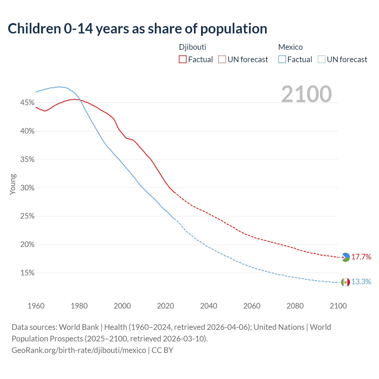 According to the latest available data on birth rates, the fertility rate in Djibouti was 2.61 children per woman in 2023, compared to 1.91 in Mexico in 2023. The replacement level is considered to be 2.1 children per woman.