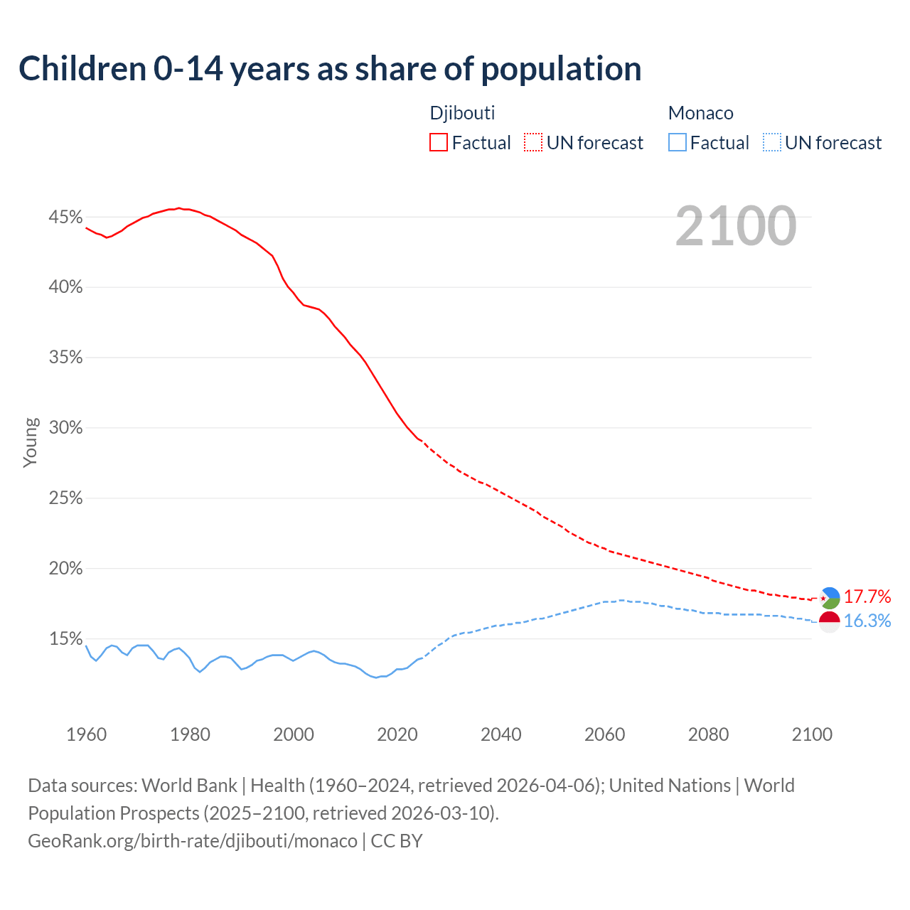 According to the latest available data on birth rates, the fertility rate in Djibouti was 2.61 children per woman in 2023, compared to 2.11 in Monaco in 2023. The replacement level is considered to be 2.1 children per woman.