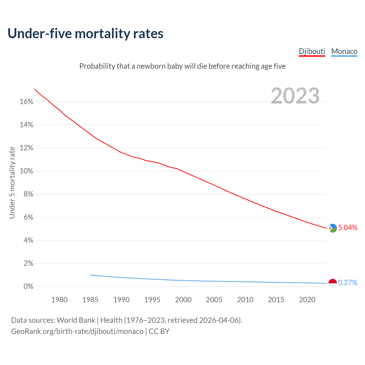 The chance that a newborn baby will die before reaching age five is 5.04% in Djibouti and 0.27% in Monaco. Above is a chart with historical data on under-five mortality rates.