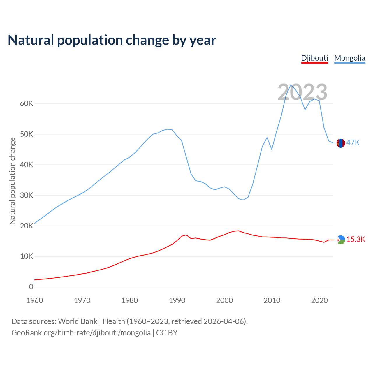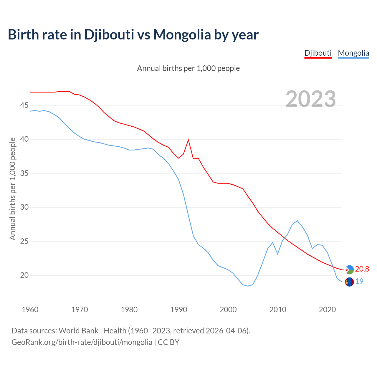 Djibouti has an annual birth rate of 20.8 births per 1,000 people, compared to 19 for Mongolia. The average number of children a woman is expected to have during her lifetime — the fertility rate, is 2.61 in Djibouti and 2.7 in Mongolia — 3.49% difference.