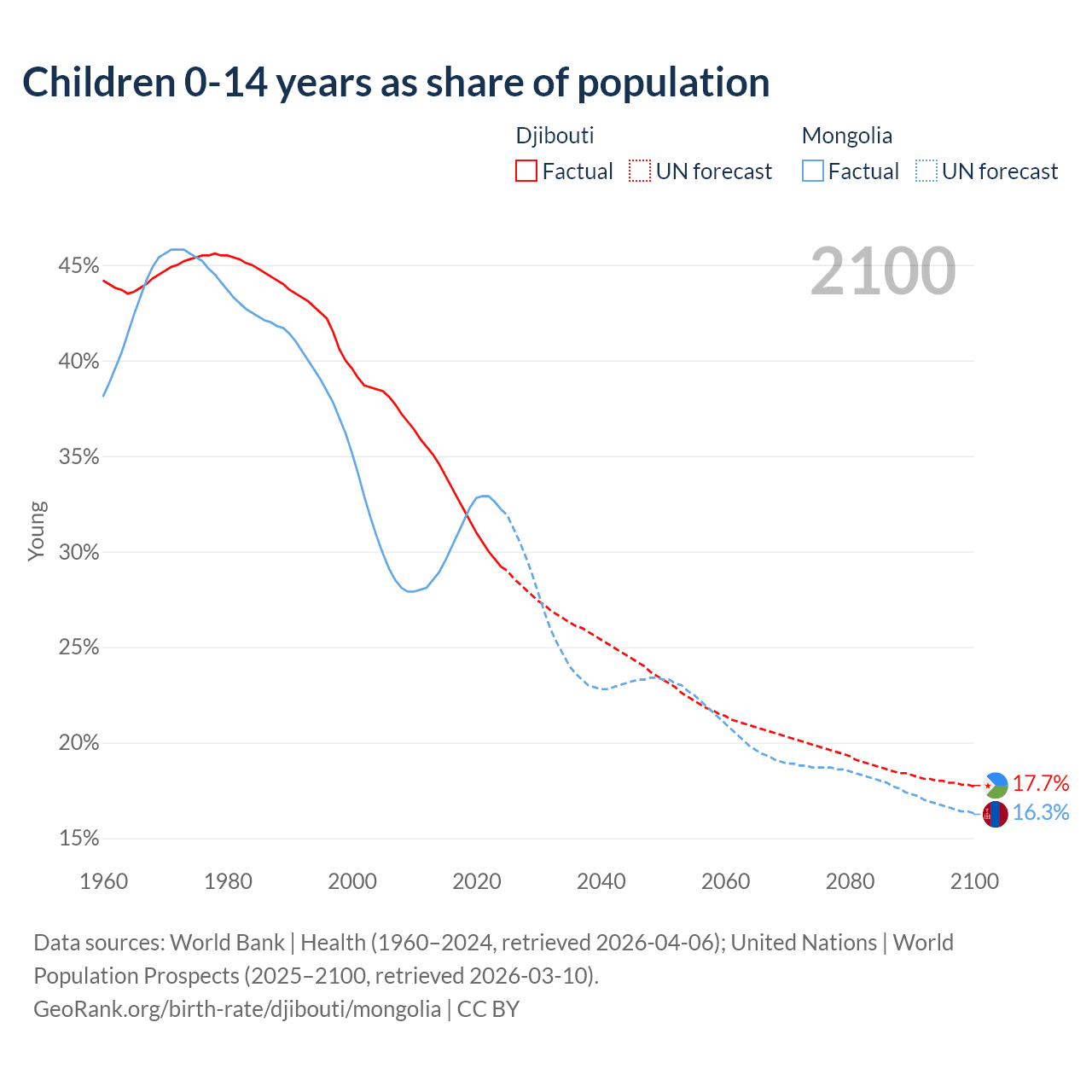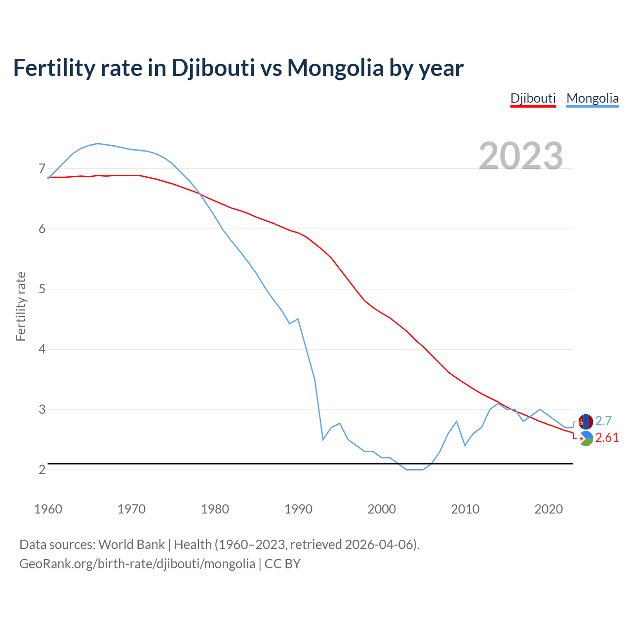 According to the latest available data on birth rates, the fertility rate in Djibouti was 2.61 children per woman in 2023, compared to 2.7 in Mongolia in 2023. The replacement level is considered to be 2.1 children per woman.