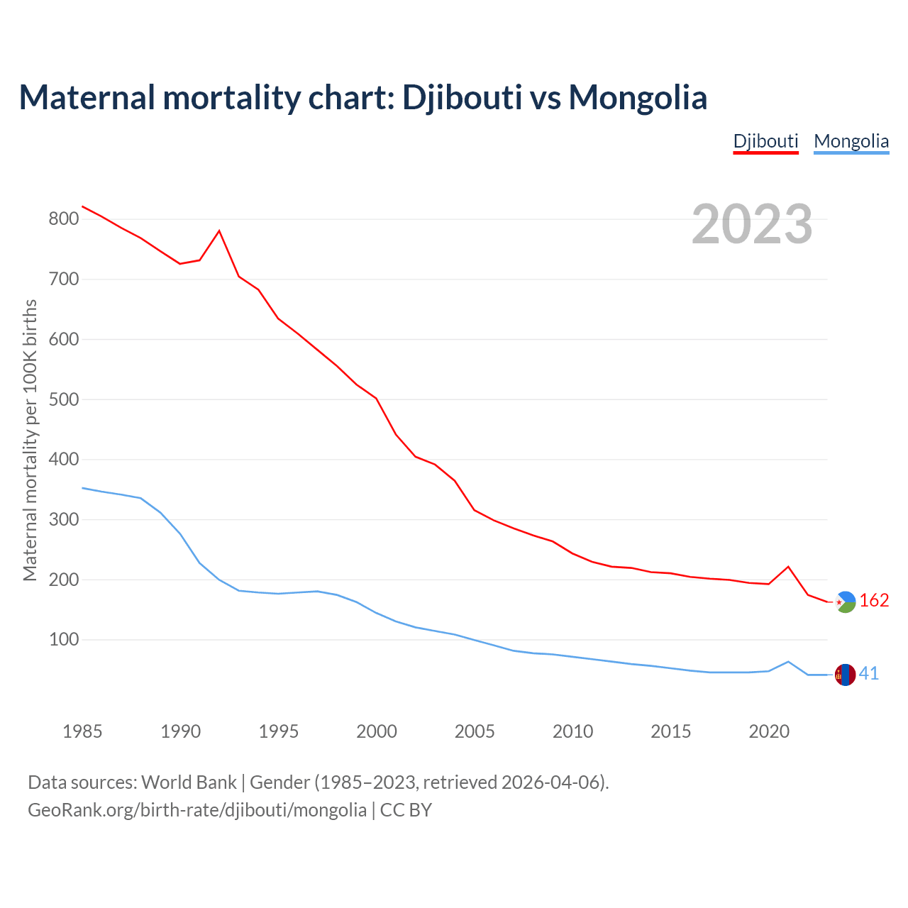 The maternal mortality rate, which is the probability of dying during childbirth or within 42 days of pregnancy termination, is 162 deaths per 100,000 live births in Djibouti, compared to 41 deaths in Mongolia.