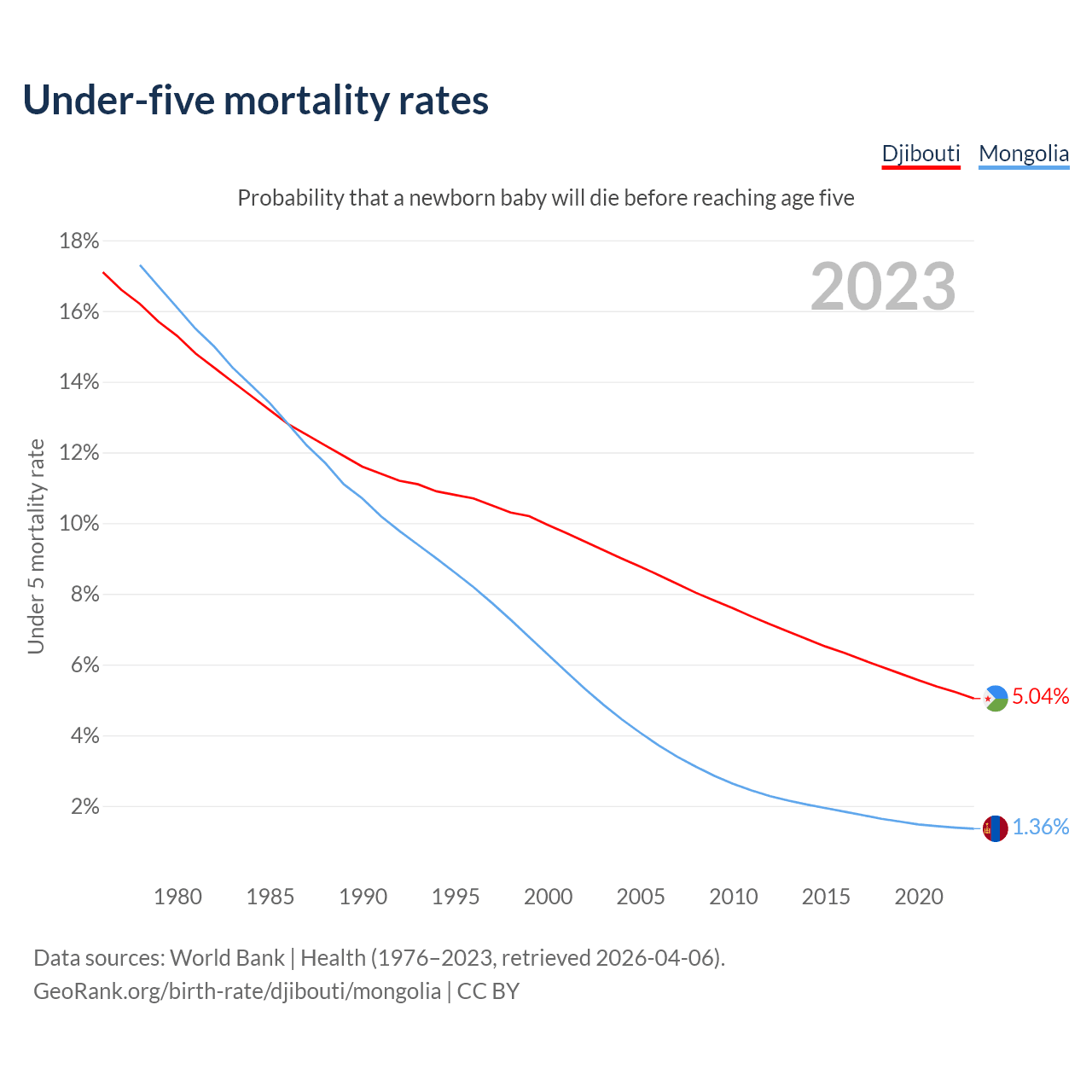 The chance that a newborn baby will die before reaching age five is 5.04% in Djibouti and 1.36% in Mongolia. Above is a chart with historical data on under-five mortality rates.