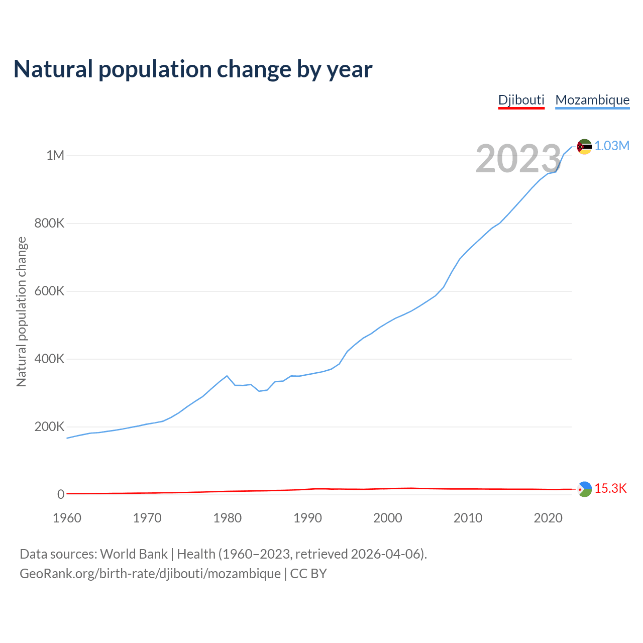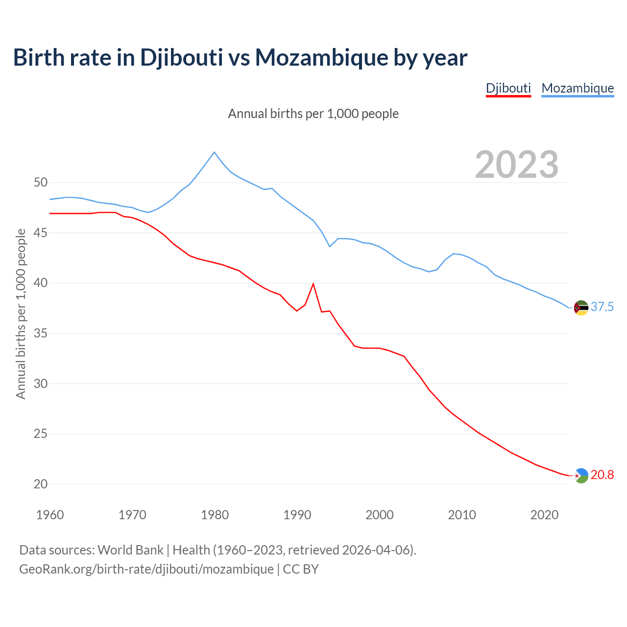Djibouti has an annual birth rate of 20.8 births per 1,000 people, compared to 37.5 for Mozambique. The average number of children a woman is expected to have during her lifetime — the fertility rate, is 2.61 in Djibouti and 4.76 in Mozambique — 82.6% difference.
