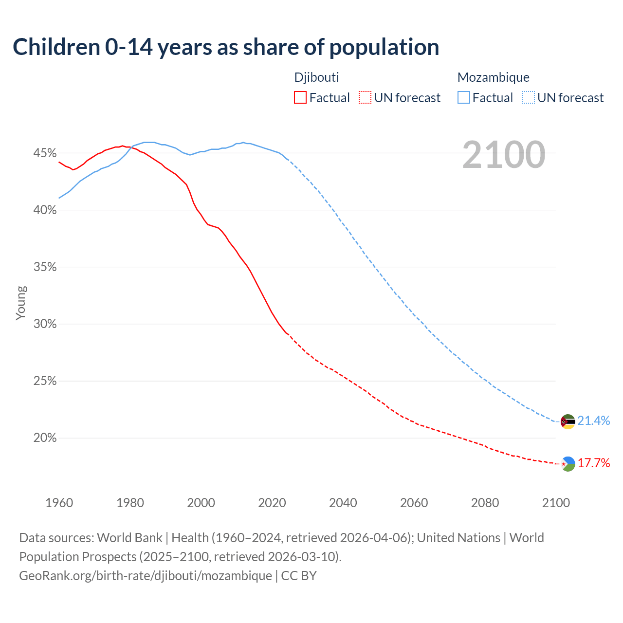 According to the latest available data on birth rates, the fertility rate in Djibouti was 2.61 children per woman in 2023, compared to 4.76 in Mozambique in 2023. The replacement level is considered to be 2.1 children per woman.