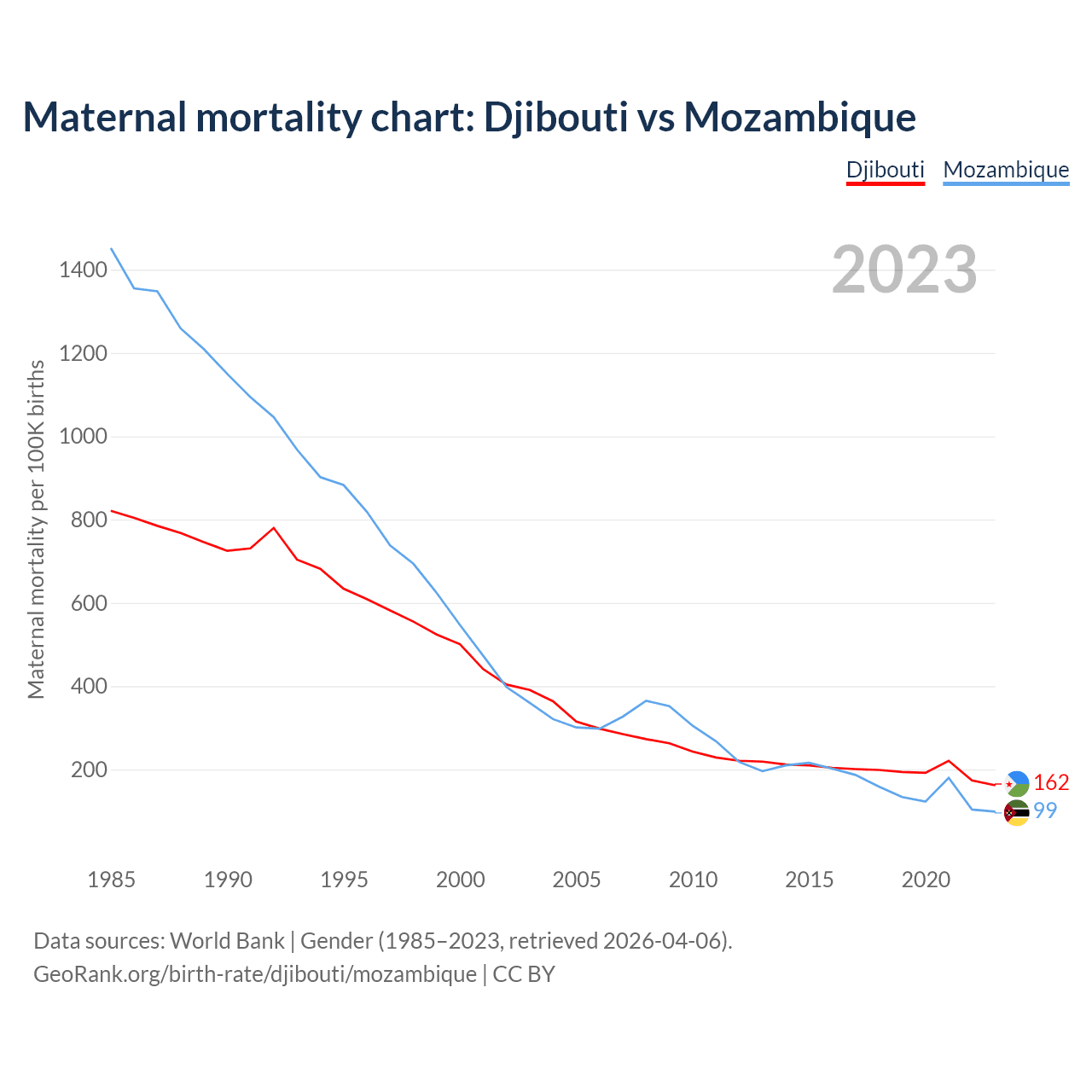 The maternal mortality rate, which is the probability of dying during childbirth or within 42 days of pregnancy termination, is 162 deaths per 100,000 live births in Djibouti, compared to 99 deaths in Mozambique.