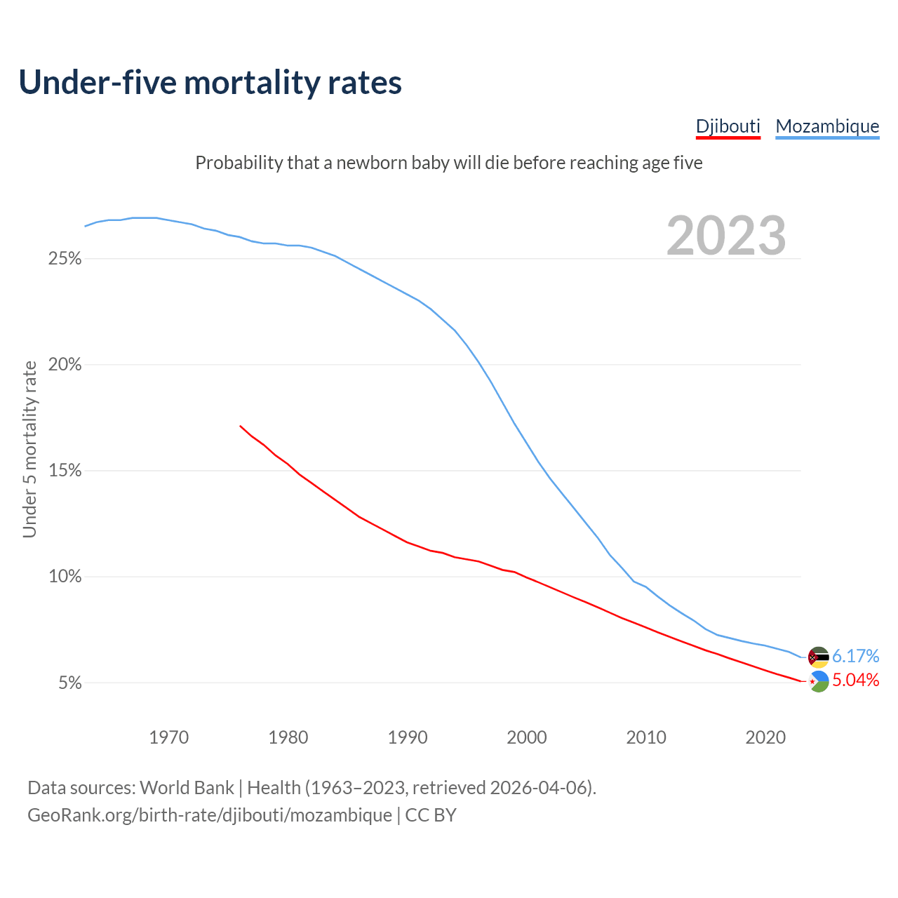 The chance that a newborn baby will die before reaching age five is 5.04% in Djibouti and 6.17% in Mozambique. Above is a chart with historical data on under-five mortality rates.