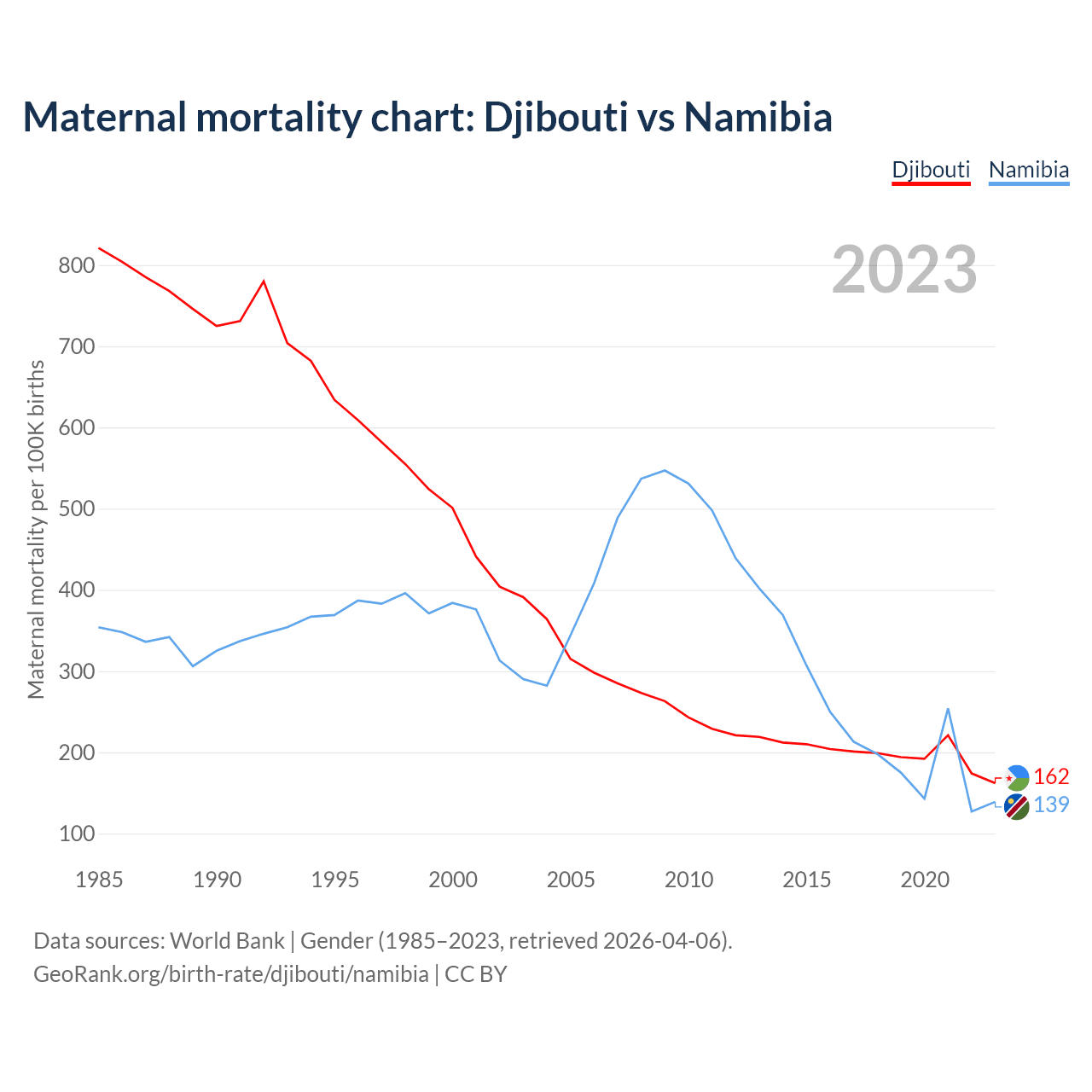 The maternal mortality rate, which is the probability of dying during childbirth or within 42 days of pregnancy termination, is 162 deaths per 100,000 live births in Djibouti, compared to 139 deaths in Namibia.