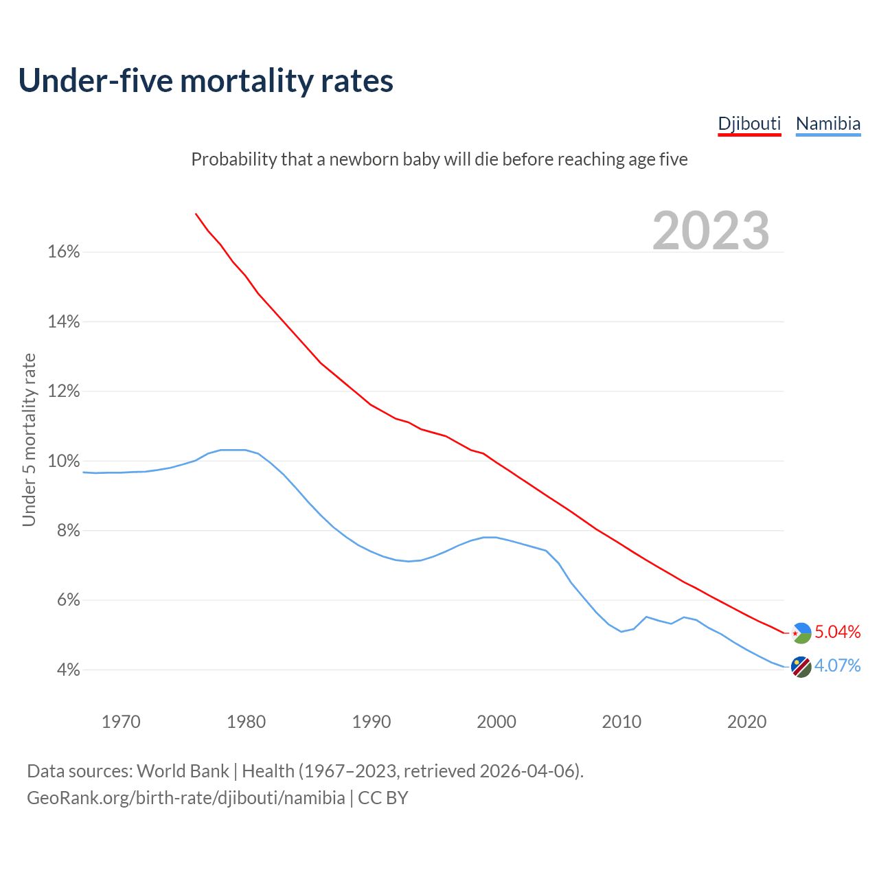 The chance that a newborn baby will die before reaching age five is 5.04% in Djibouti and 4.07% in Namibia. Above is a chart with historical data on under-five mortality rates.