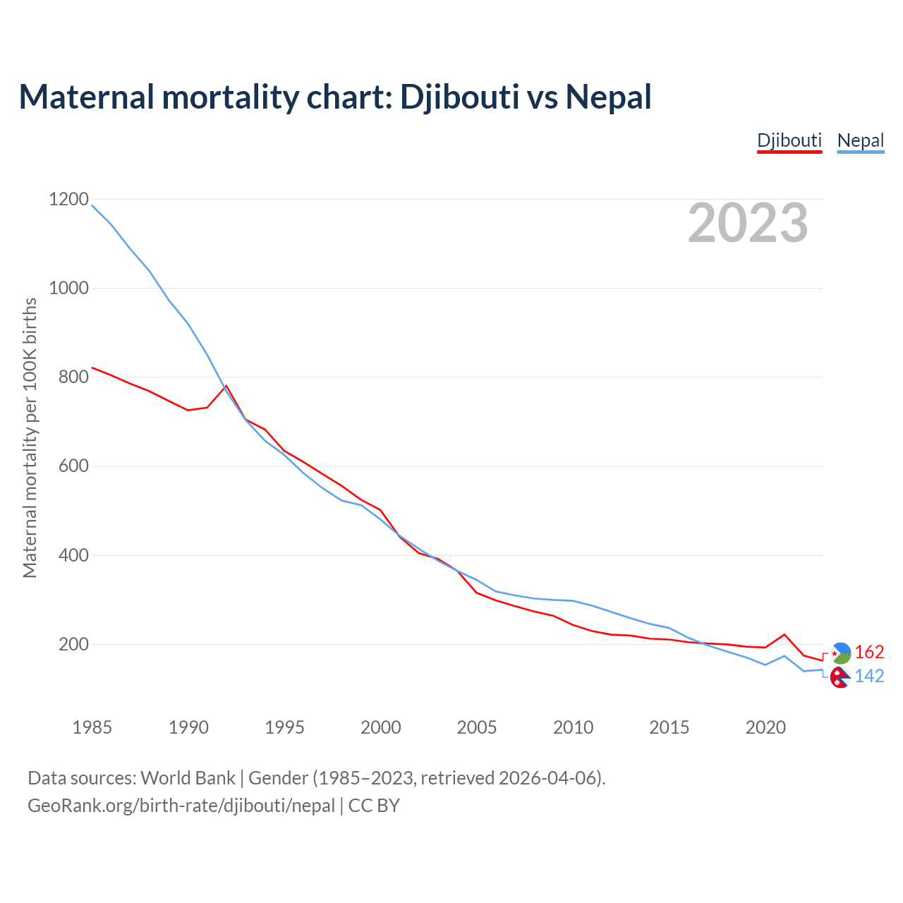 The maternal mortality rate, which is the probability of dying during childbirth or within 42 days of pregnancy termination, is 162 deaths per 100,000 live births in Djibouti, compared to 142 deaths in Nepal.