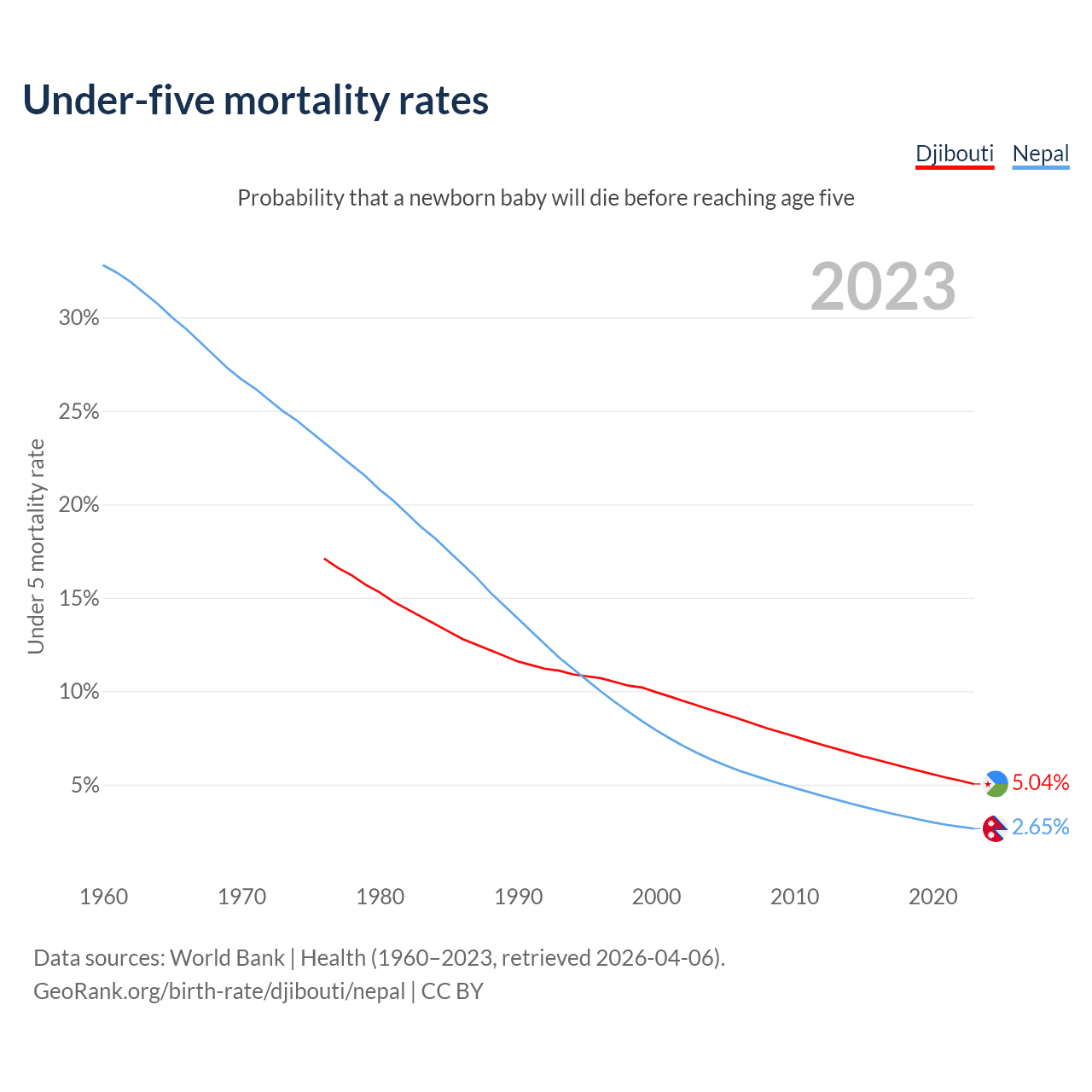 The chance that a newborn baby will die before reaching age five is 5.04% in Djibouti and 2.65% in Nepal. Above is a chart with historical data on under-five mortality rates.