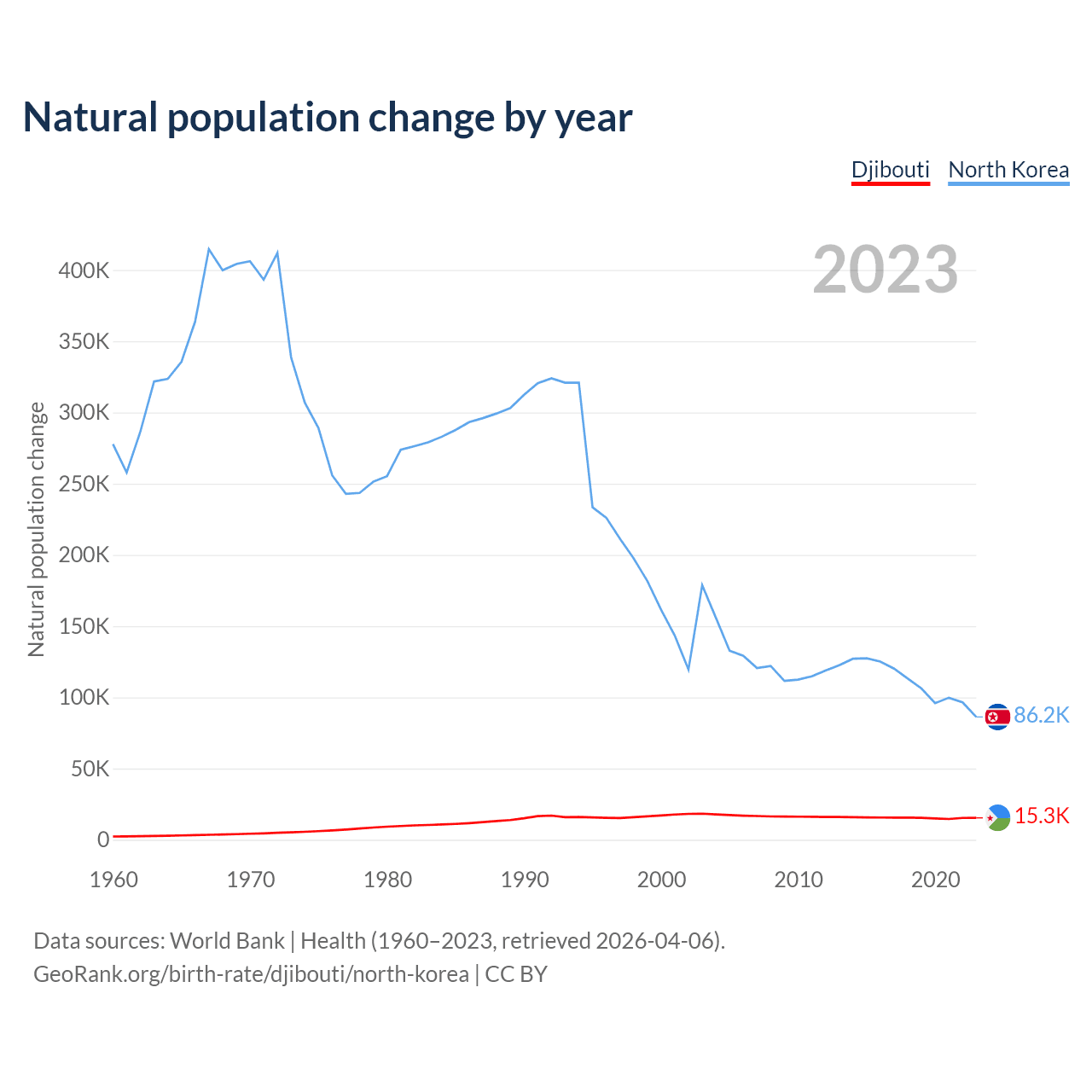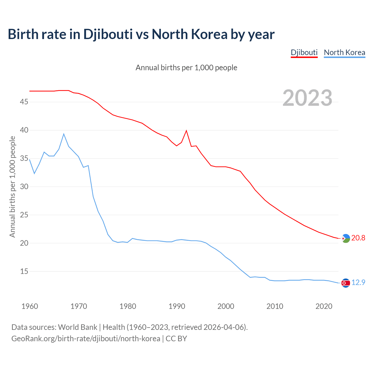 Djibouti has an annual birth rate of 20.8 births per 1,000 people, compared to 12.9 for North Korea. The average number of children a woman is expected to have during her lifetime — the fertility rate, is 2.61 in Djibouti and 1.78 in North Korea — 31.8% difference.