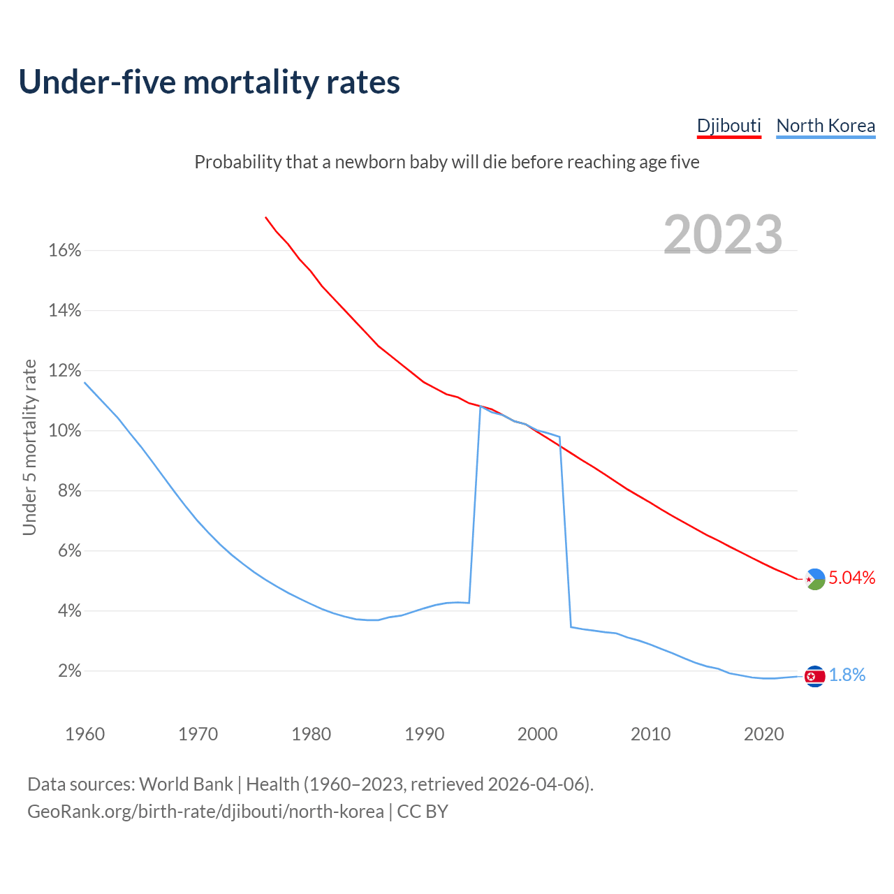The chance that a newborn baby will die before reaching age five is 5.04% in Djibouti and 1.8% in North Korea. Above is a chart with historical data on under-five mortality rates.