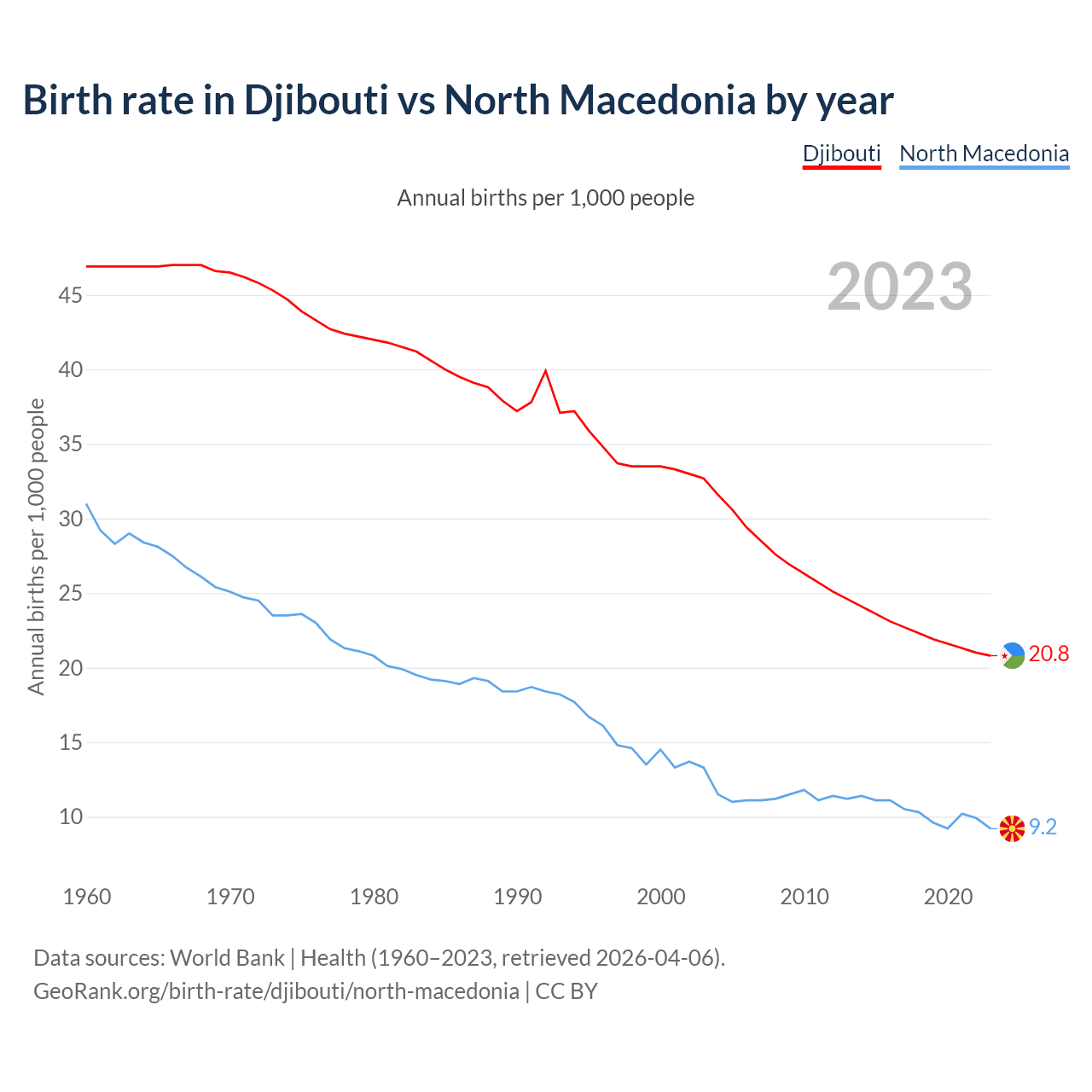 Djibouti has an annual birth rate of 20.8 births per 1,000 people, compared to 9.2 for North Macedonia. The average number of children a woman is expected to have during her lifetime — the fertility rate, is 2.61 in Djibouti and 1.5 in North Macedonia — 42.5% difference.