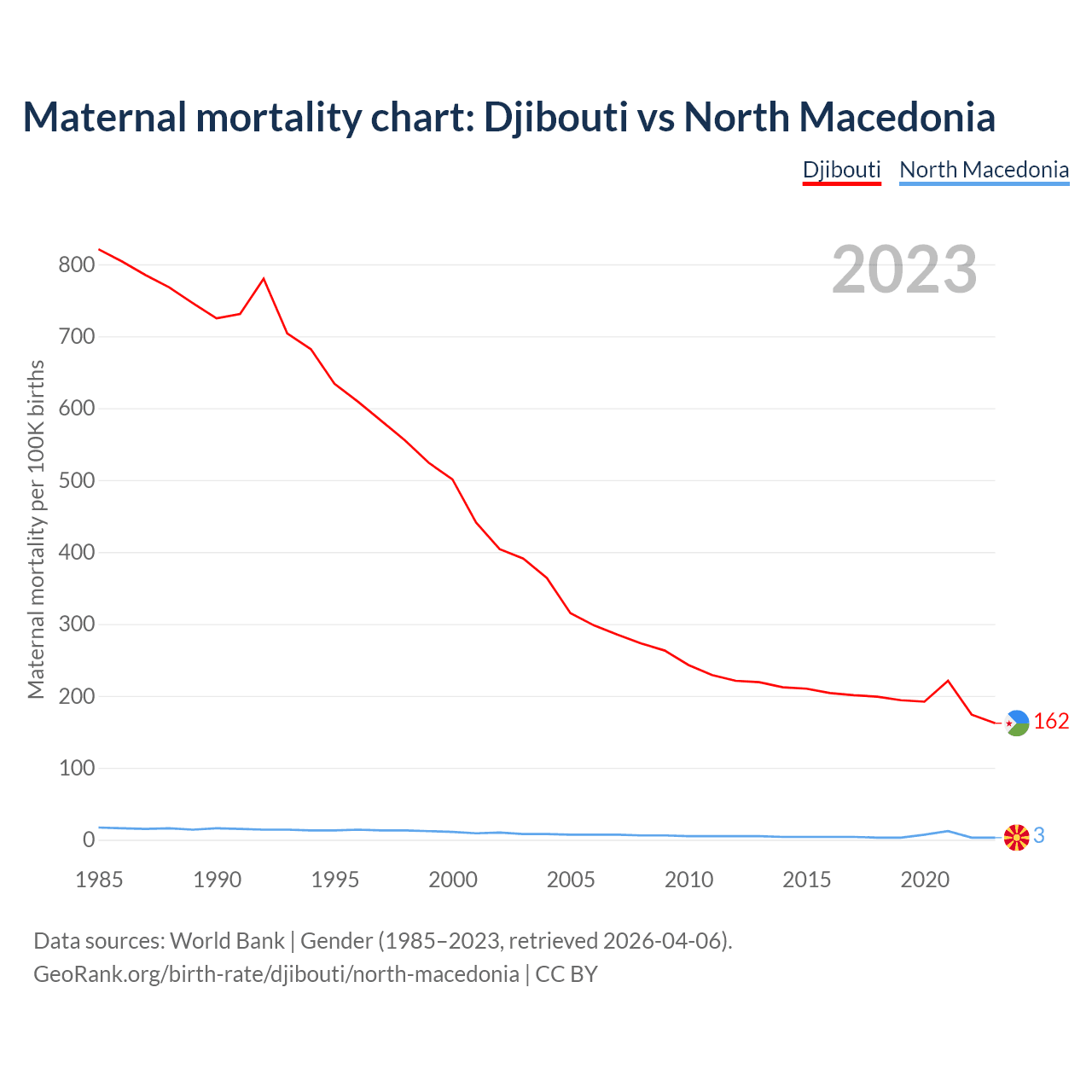 The maternal mortality rate, which is the probability of dying during childbirth or within 42 days of pregnancy termination, is 162 deaths per 100,000 live births in Djibouti, compared to 3 deaths in North Macedonia.