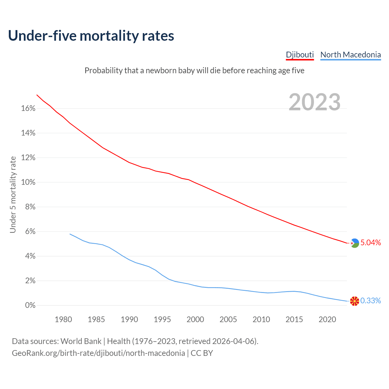 The chance that a newborn baby will die before reaching age five is 5.04% in Djibouti and 0.33% in North Macedonia. Above is a chart with historical data on under-five mortality rates.