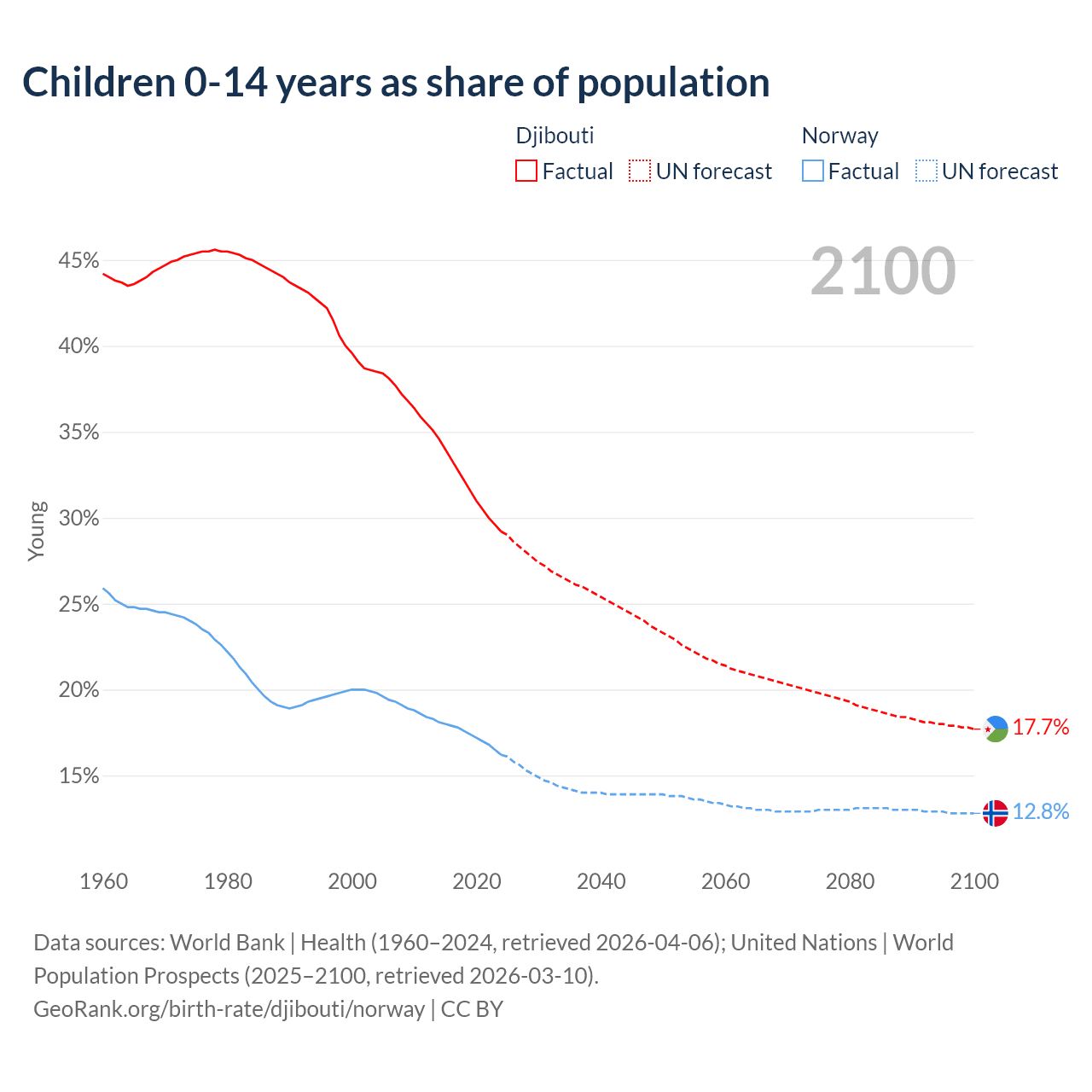 According to the latest available data on birth rates, the fertility rate in Djibouti was 2.61 children per woman in 2023, compared to 1.4 in Norway in 2023. The replacement level is considered to be 2.1 children per woman.