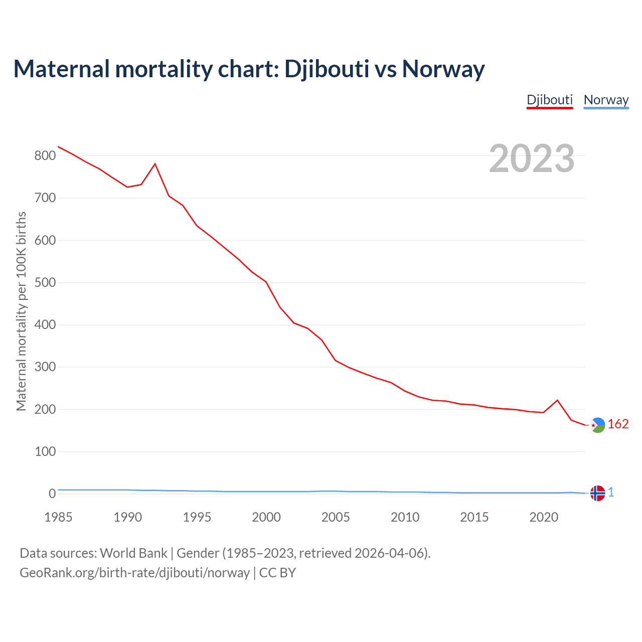 The maternal mortality rate, which is the probability of dying during childbirth or within 42 days of pregnancy termination, is 162 deaths per 100,000 live births in Djibouti, compared to 1 deaths in Norway.