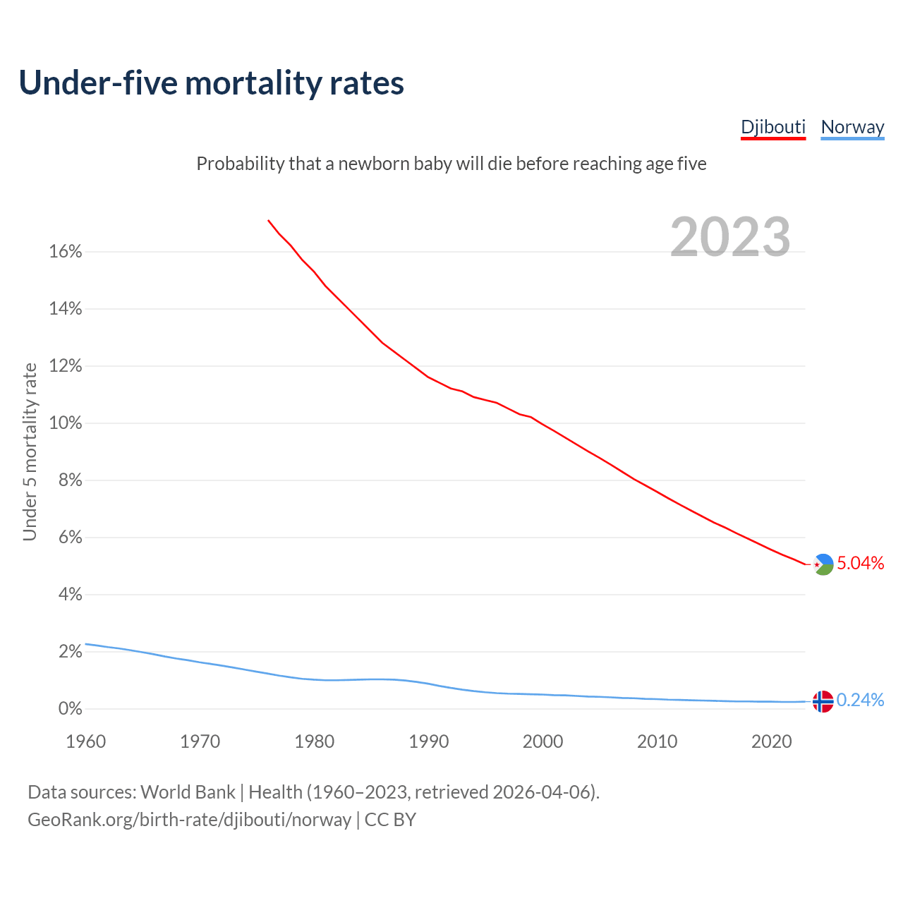 The chance that a newborn baby will die before reaching age five is 5.04% in Djibouti and 0.24% in Norway. Above is a chart with historical data on under-five mortality rates.