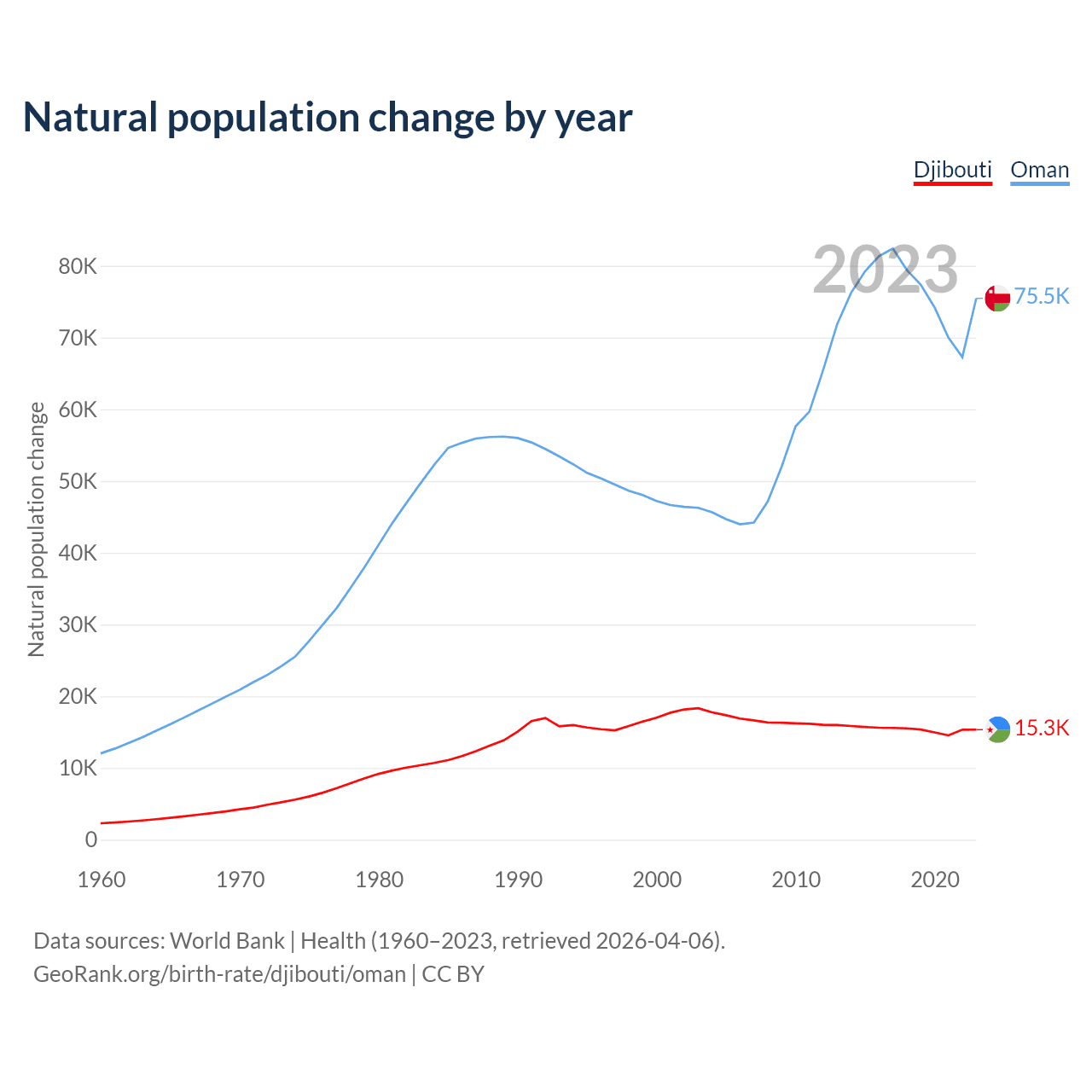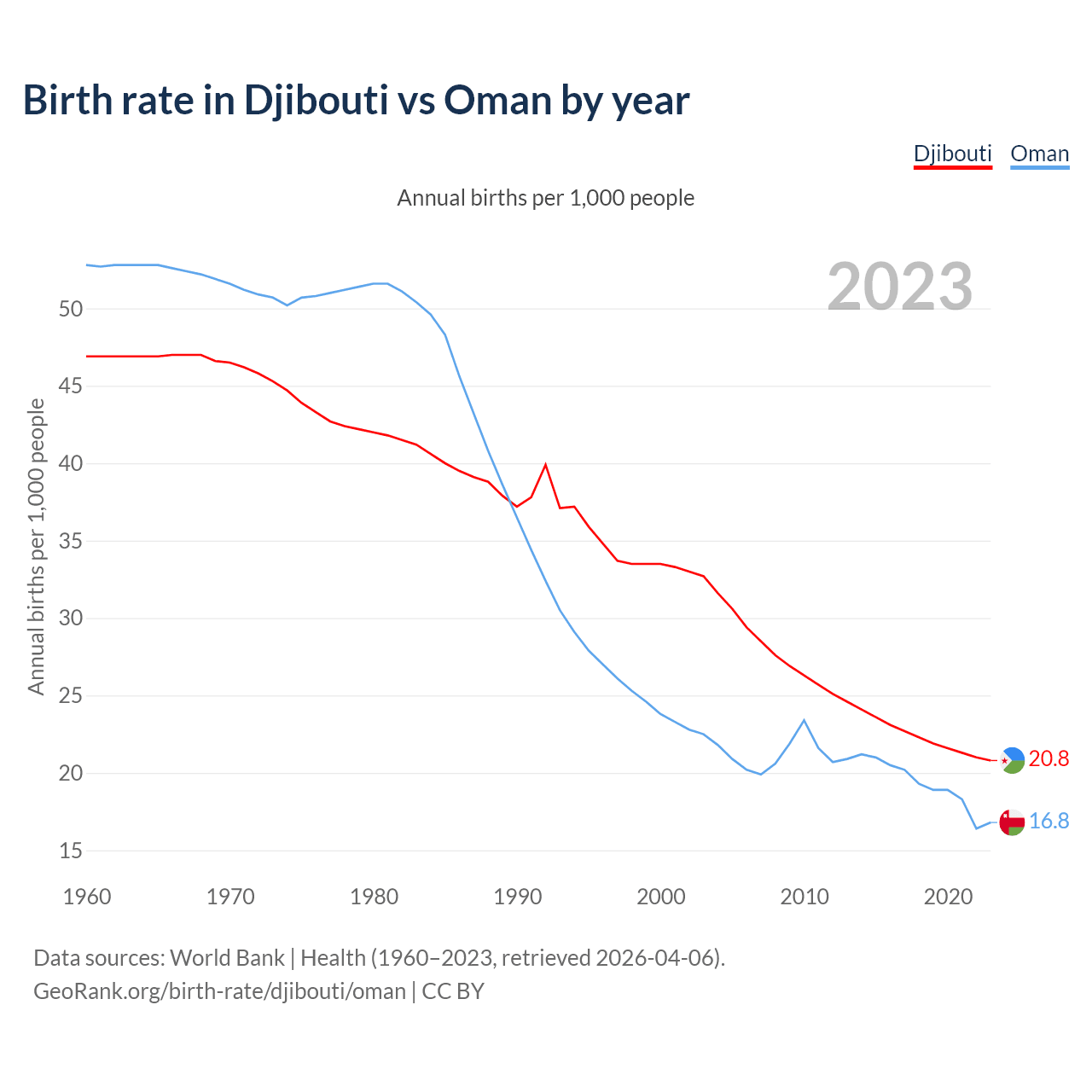 Djibouti has an annual birth rate of 20.8 births per 1,000 people, compared to 16.8 for Oman. The average number of children a woman is expected to have during her lifetime — the fertility rate, is 2.61 in Djibouti and 2.53 in Oman — 3.22% difference.