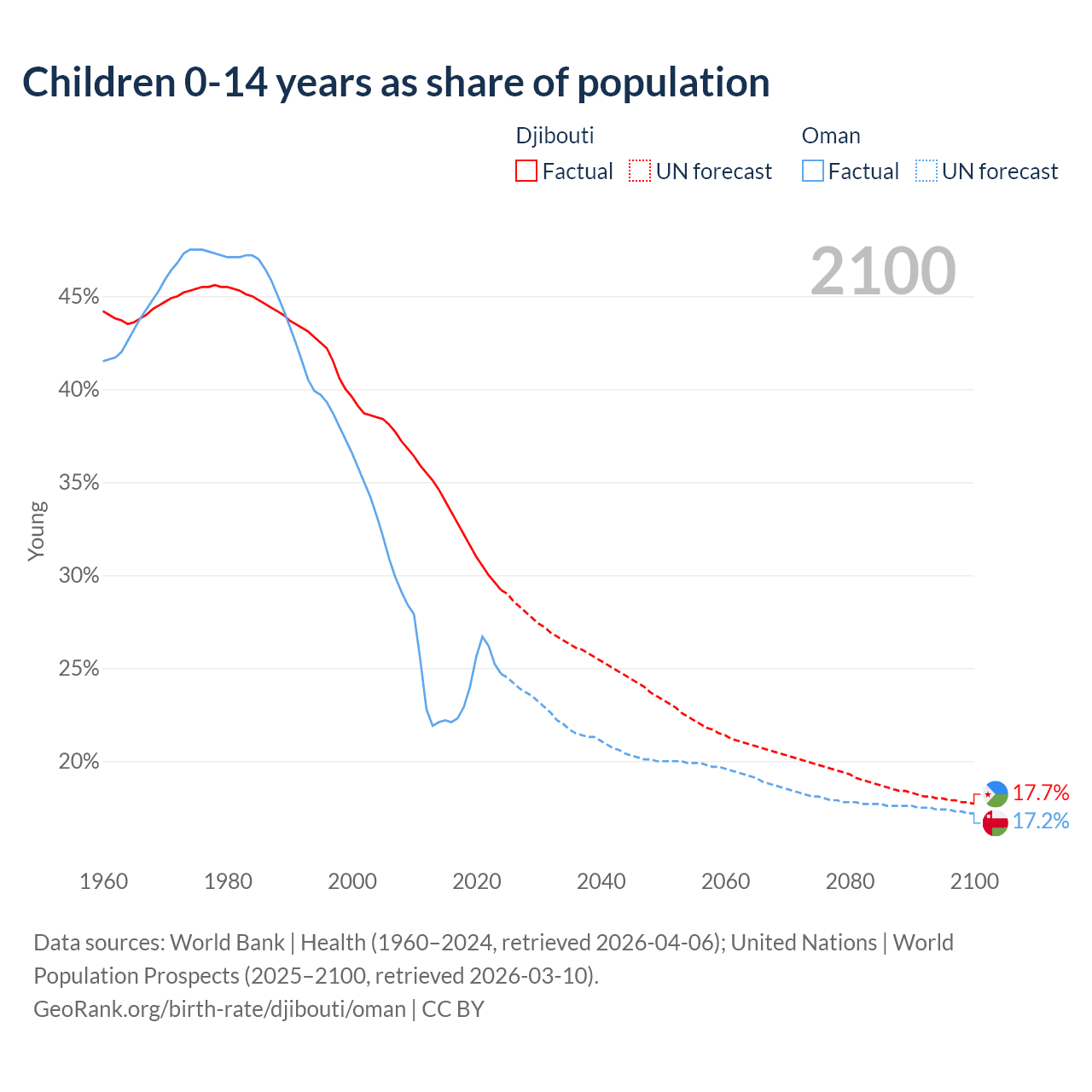 According to the latest available data on birth rates, the fertility rate in Djibouti was 2.61 children per woman in 2023, compared to 2.53 in Oman in 2023. The replacement level is considered to be 2.1 children per woman.