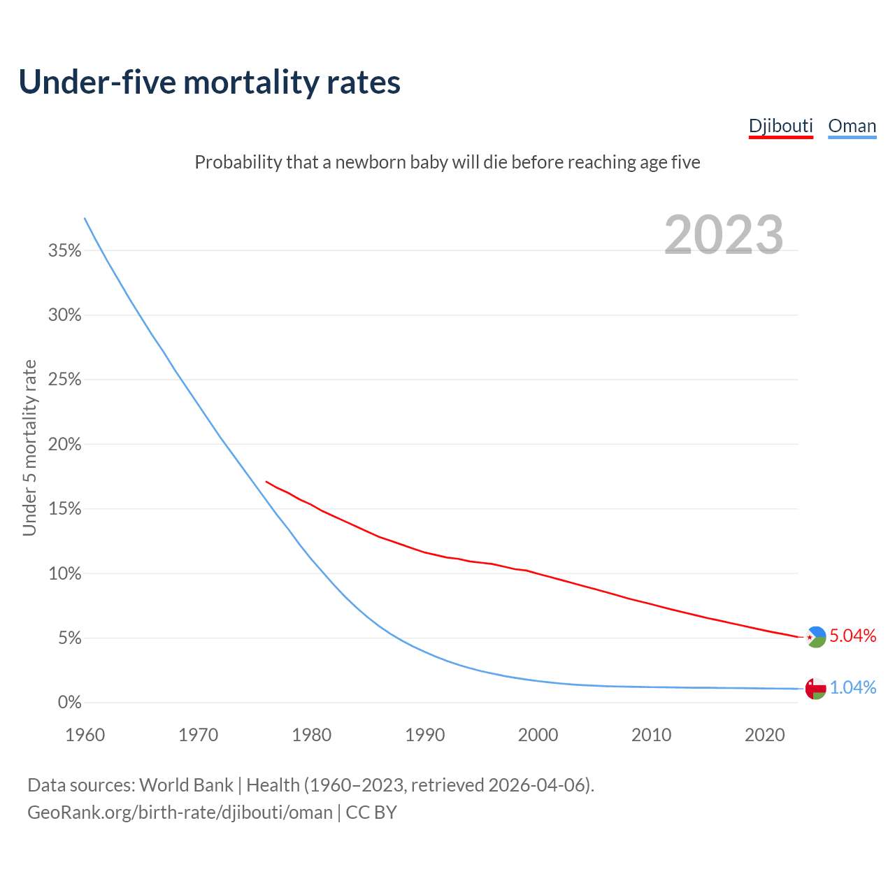 The chance that a newborn baby will die before reaching age five is 5.04% in Djibouti and 1.04% in Oman. Above is a chart with historical data on under-five mortality rates.
