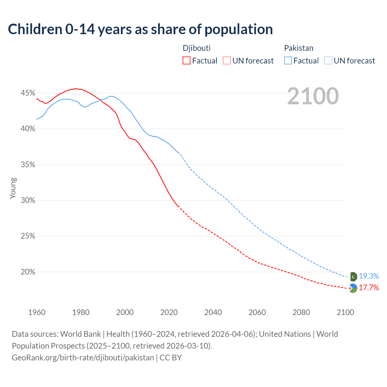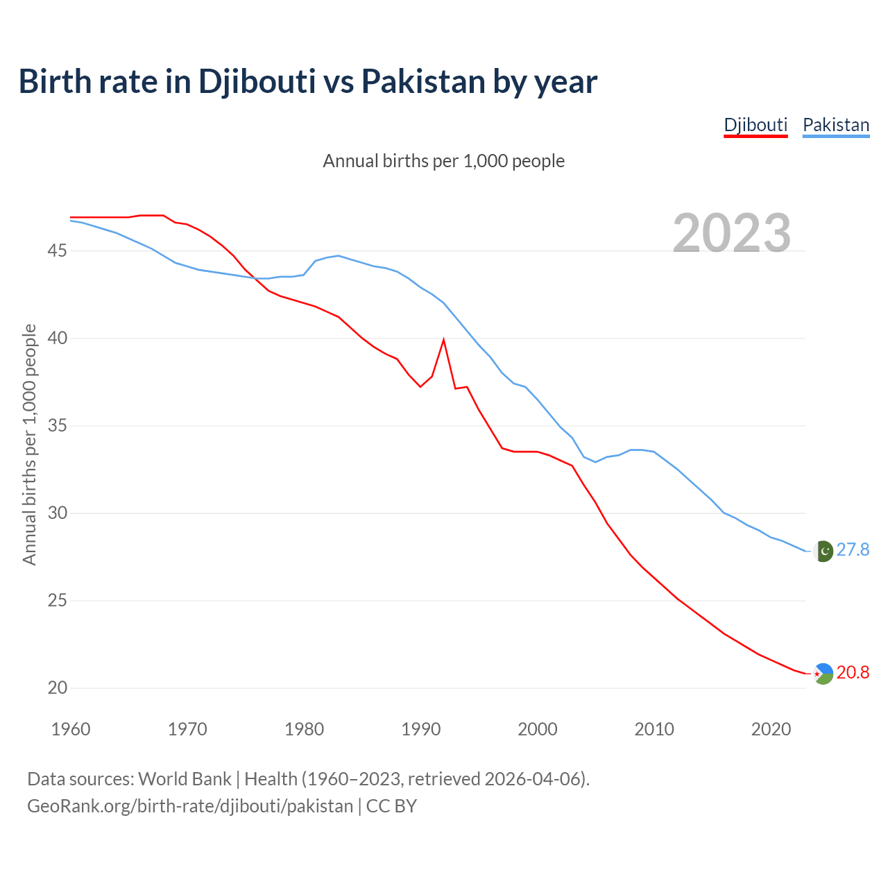 Djibouti has an annual birth rate of 20.8 births per 1,000 people, compared to 27.8 for Pakistan. The average number of children a woman is expected to have during her lifetime — the fertility rate, is 2.61 in Djibouti and 3.61 in Pakistan — 38.2% difference.