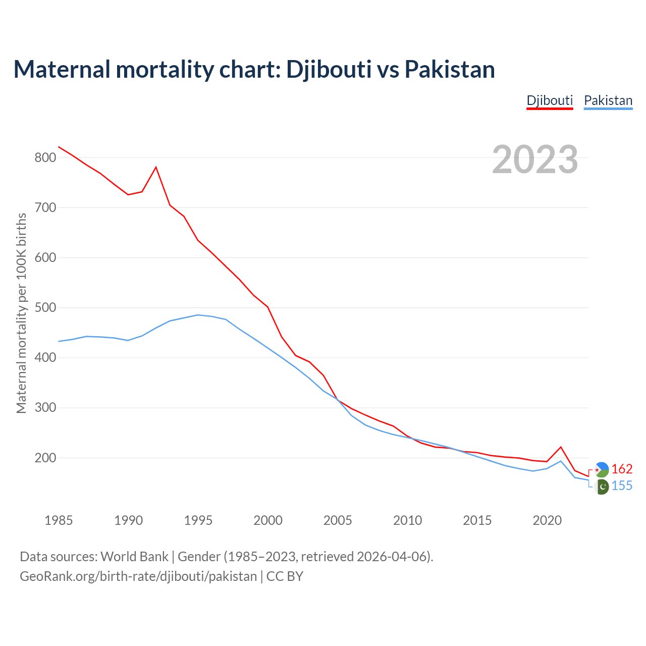 The maternal mortality rate, which is the probability of dying during childbirth or within 42 days of pregnancy termination, is 162 deaths per 100,000 live births in Djibouti, compared to 155 deaths in Pakistan.