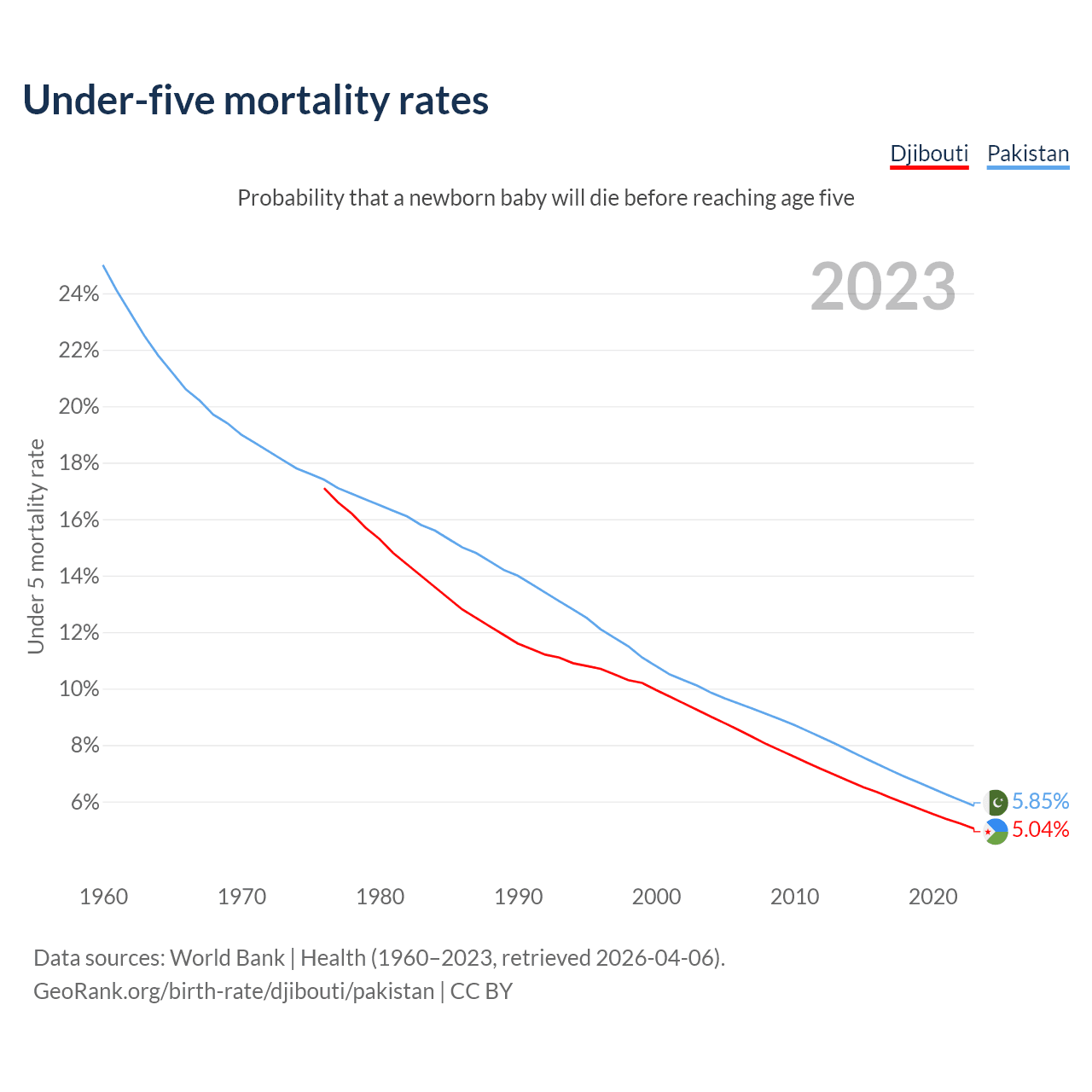 The chance that a newborn baby will die before reaching age five is 5.04% in Djibouti and 5.85% in Pakistan. Above is a chart with historical data on under-five mortality rates.