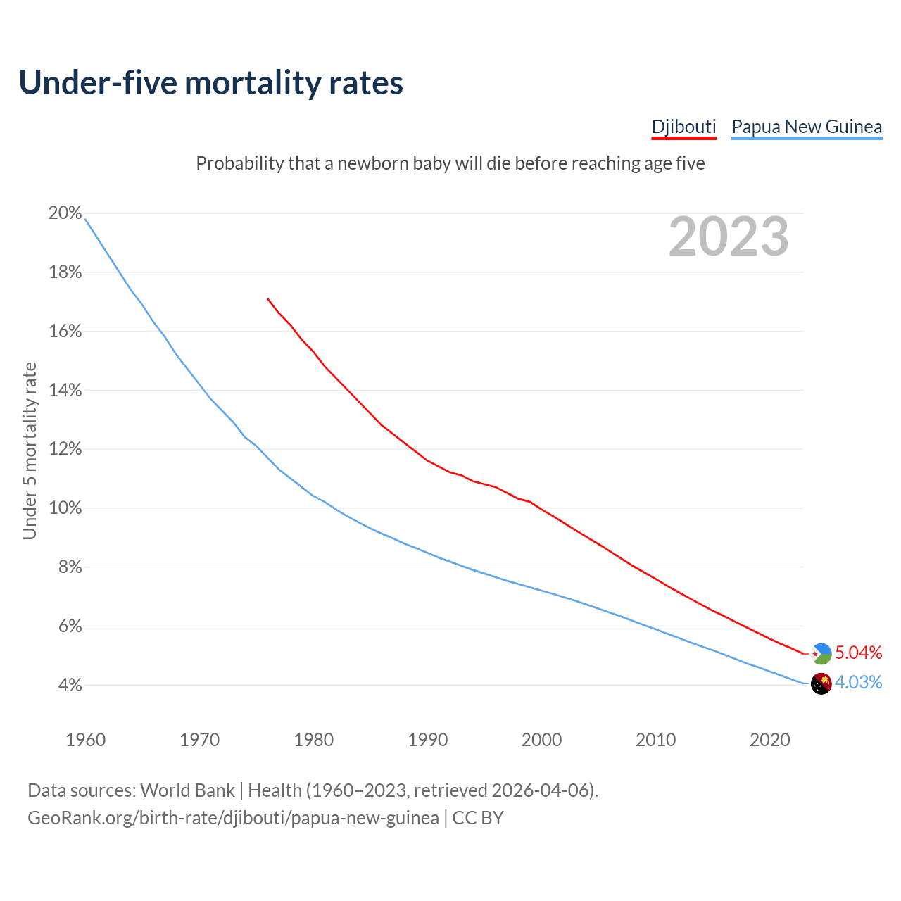 The chance that a newborn baby will die before reaching age five is 5.04% in Djibouti and 4.03% in Papua New Guinea. Above is a chart with historical data on under-five mortality rates.