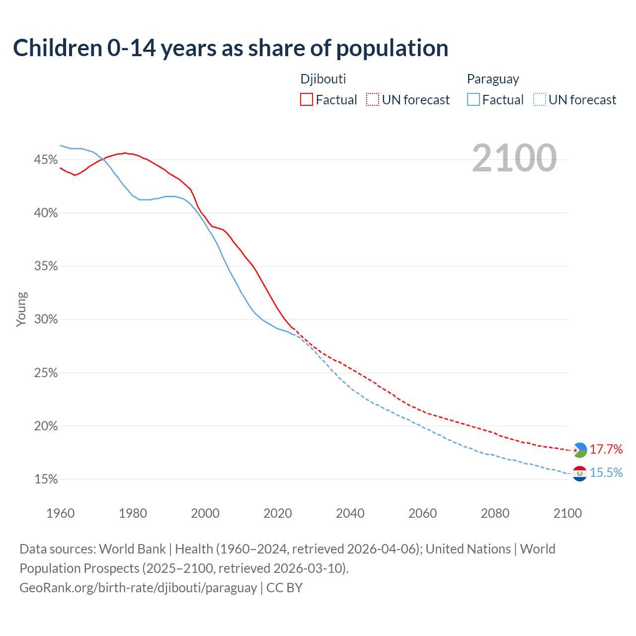 According to the latest available data on birth rates, the fertility rate in Djibouti was 2.61 children per woman in 2023, compared to 2.42 in Paraguay in 2023. The replacement level is considered to be 2.1 children per woman.