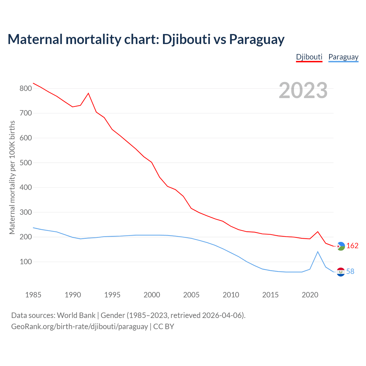 The maternal mortality rate, which is the probability of dying during childbirth or within 42 days of pregnancy termination, is 162 deaths per 100,000 live births in Djibouti, compared to 58 deaths in Paraguay.