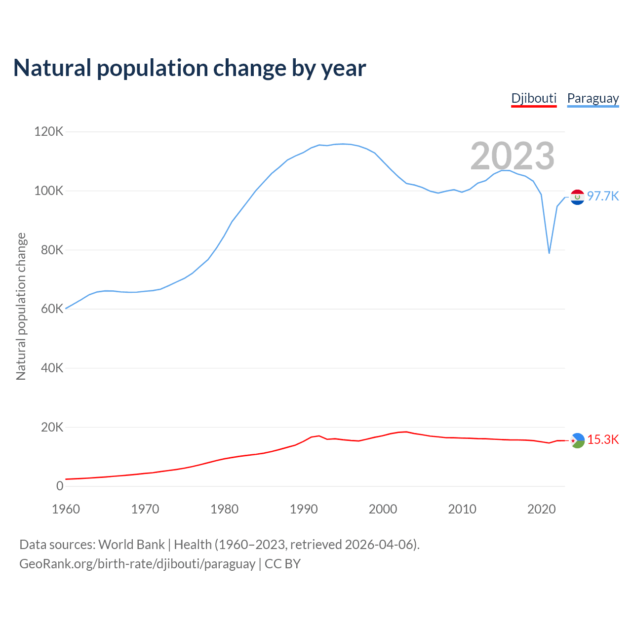 Djibouti has an annual birth rate of 20.8 births per 1,000 people, compared to 20 for Paraguay. The average number of children a woman is expected to have during her lifetime — the fertility rate, is 2.61 in Djibouti and 2.42 in Paraguay — 7.17% difference.