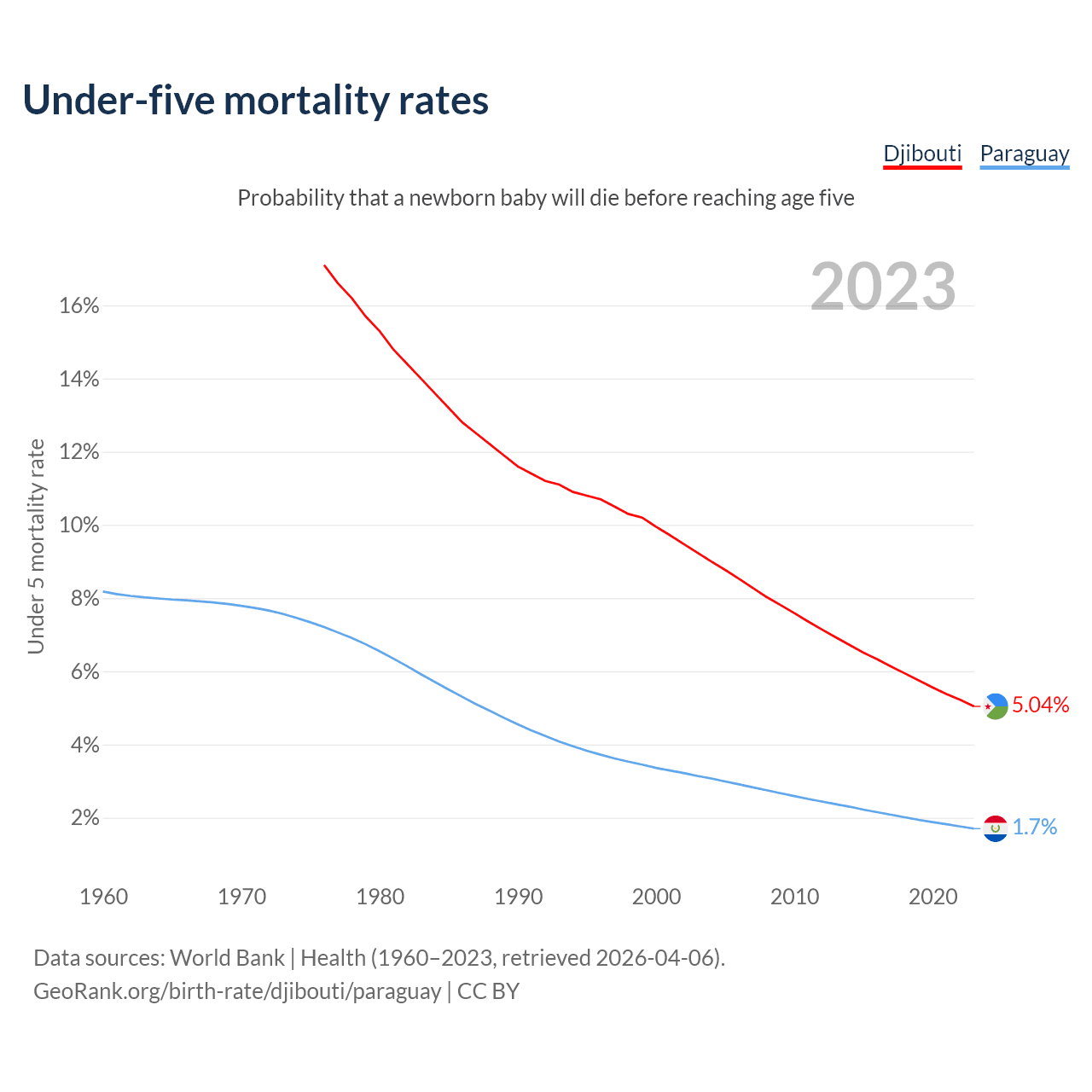 The chance that a newborn baby will die before reaching age five is 5.04% in Djibouti and 1.7% in Paraguay. Above is a chart with historical data on under-five mortality rates.
