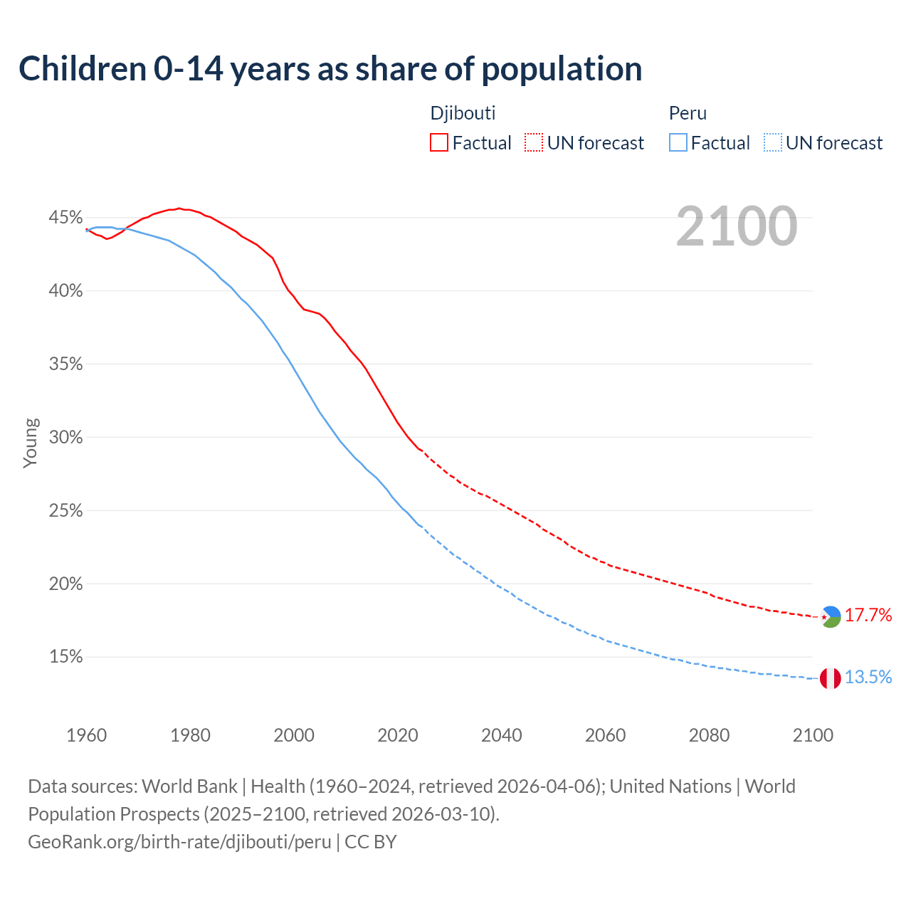 According to the latest available data on birth rates, the fertility rate in Djibouti was 2.61 children per woman in 2023, compared to 1.98 in Peru in 2023. The replacement level is considered to be 2.1 children per woman.