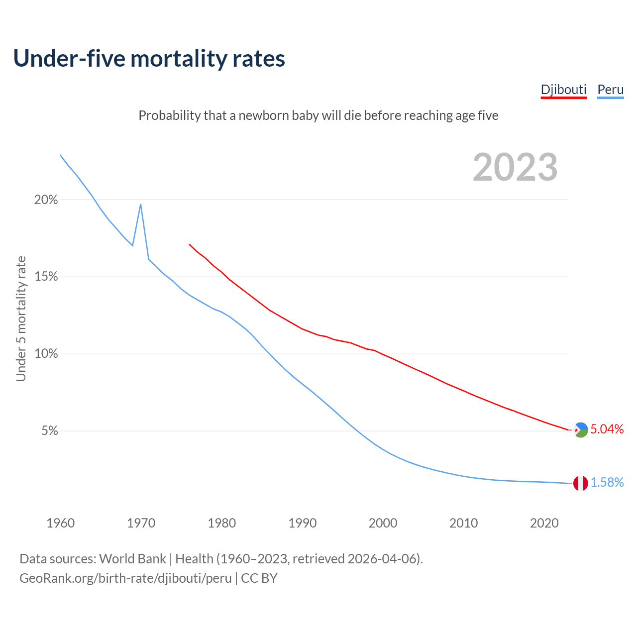 The chance that a newborn baby will die before reaching age five is 5.04% in Djibouti and 1.58% in Peru. Above is a chart with historical data on under-five mortality rates.