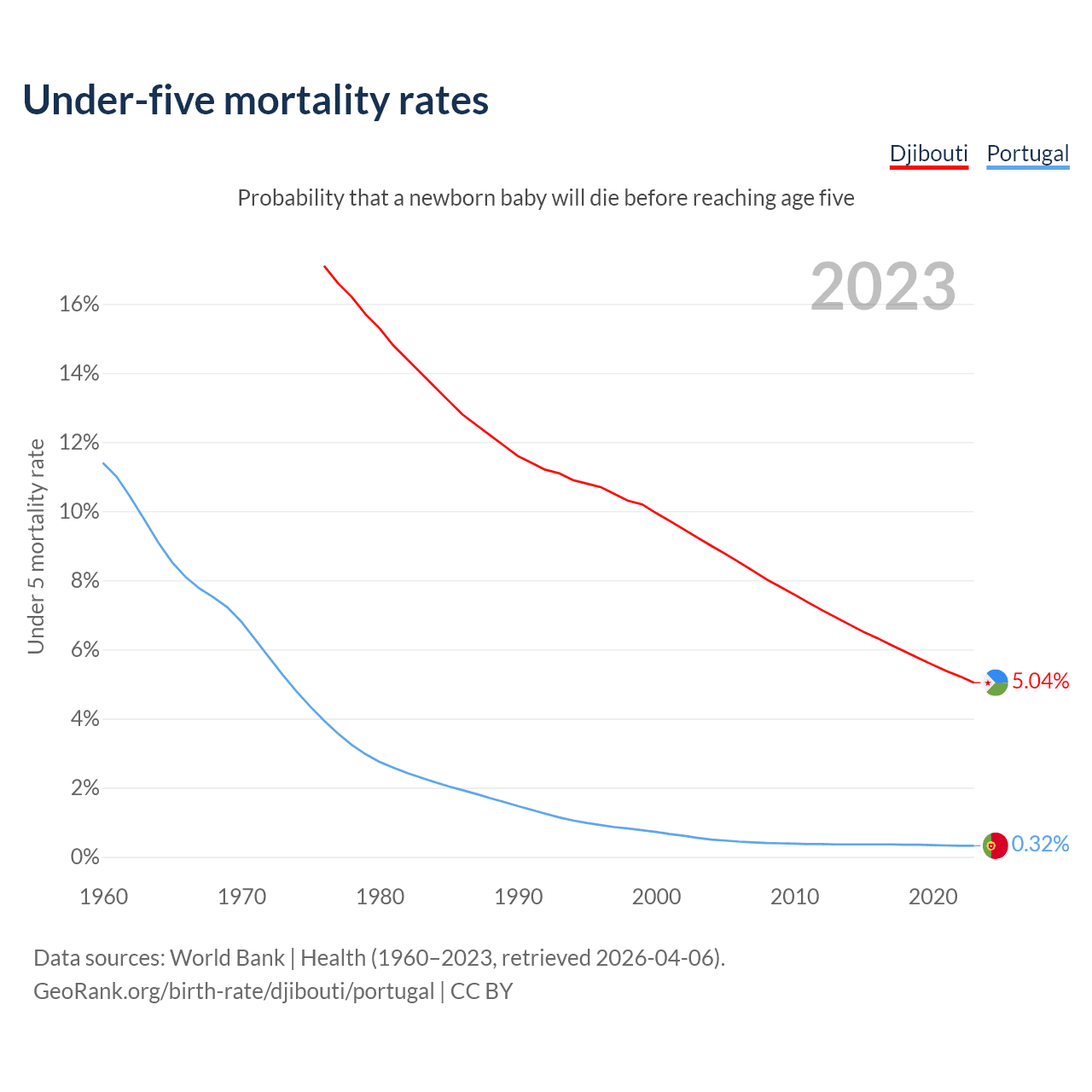 The chance that a newborn baby will die before reaching age five is 5.04% in Djibouti and 0.32% in Portugal. Above is a chart with historical data on under-five mortality rates.