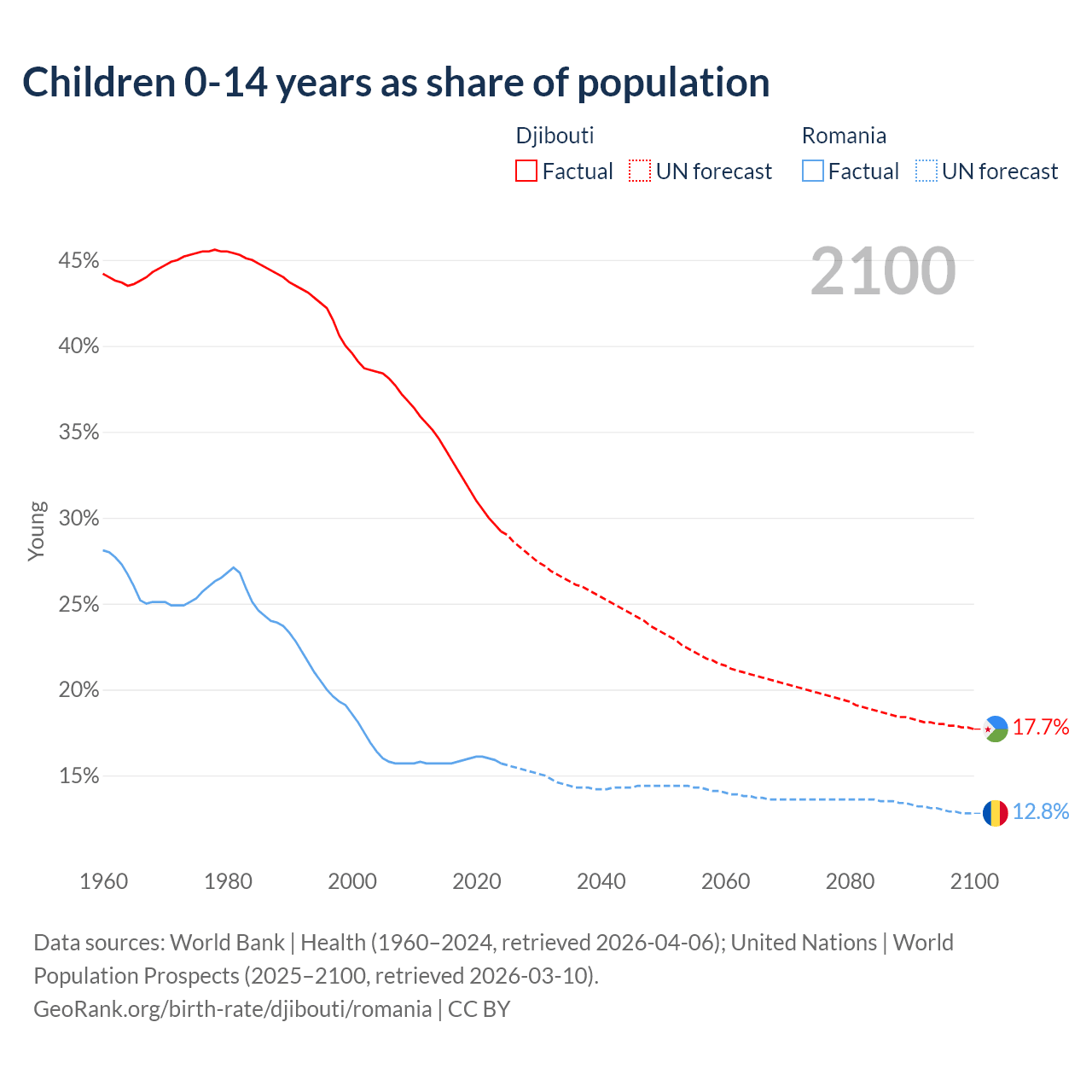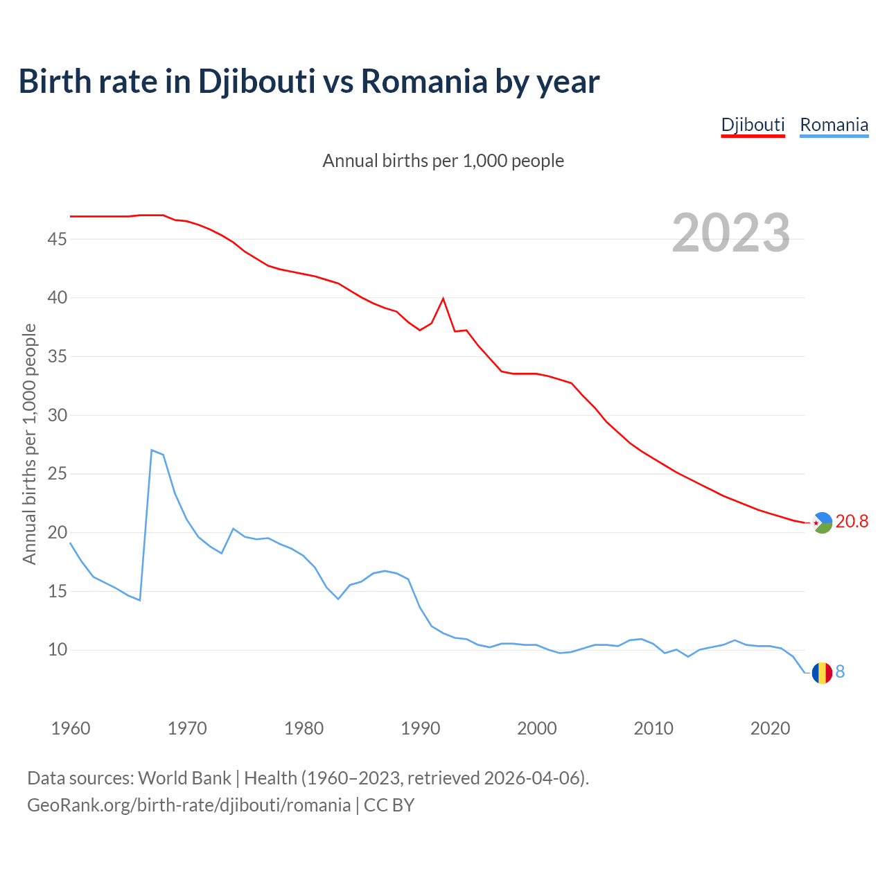 Djibouti has an annual birth rate of 20.8 births per 1,000 people, compared to 8 for Romania. The average number of children a woman is expected to have during her lifetime — the fertility rate, is 2.61 in Djibouti and 1.71 in Romania — 34.5% difference.