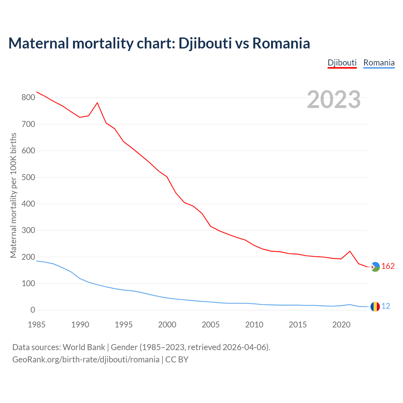 The maternal mortality rate, which is the probability of dying during childbirth or within 42 days of pregnancy termination, is 162 deaths per 100,000 live births in Djibouti, compared to 12 deaths in Romania.
